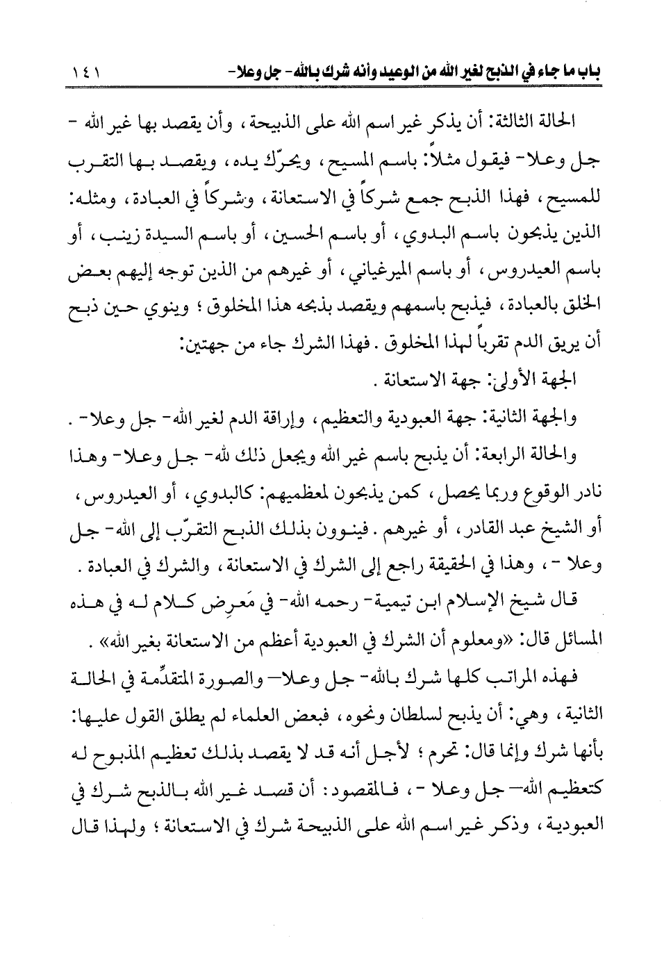 ـــــــــــــــــــــــــــــQالحالة الثالثة: أن يذكر غير اسم الله على الذبيحة، وأن يقصد بها غير الله - جل وعلا - فيقول مثلا: باسم المسيح، ويحرك يده، ويقصد بها التقرب للمسيح، فهذا الذبح جمع شركا في الاستعانة، وشركا في العبادة، ومثله: الذين يذبحون باسم البدوي، أو باسم الحسين، أو باسم السيدة زينب، أو باسم العيدروس، أو باسم الميرغياني، أو غيرهم من الذين توجه إليهم بعض الخلق بالعبادة، فيذبح باسمهم ويقصد بذبحه هذا المخلوق؛ وينوي حين ذبح أن يريق الدم تقربا لهذا المخلوق. فهذا الشرك جاء من جهتين: