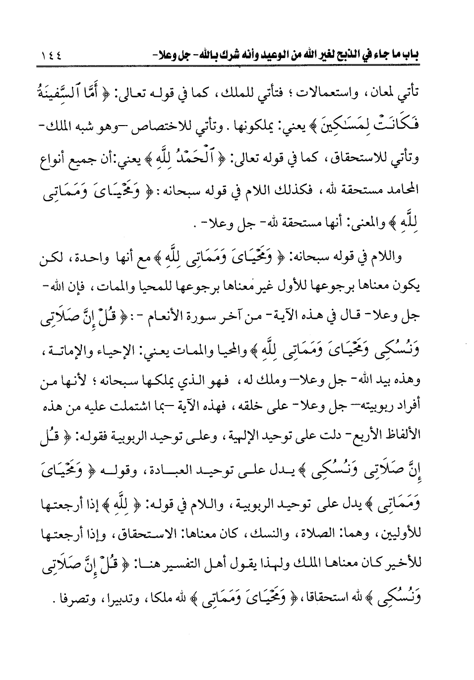 واللام في قوله سبحانه {وَمَحْيَايَ وَمَمَاتِي لِلَّهِ} [الأنعام: 162] مع أنها واحدة، لكن يكون معناها برجوعها للأول غير معناها برجوعها للمحيا والممات، فإن الله - جل وعلا - قال في هذه الآية من آخر سورة الأنعام: {قُلْ إِنَّ صَلَاتِي وَنُسُكِي وَمَحْيَايَ وَمَمَاتِي لِلَّهِ} [الأنعام: 162] والمحيا والممات يعني: الإحياء والإماتة، وهذه بيد الله - جل وعلا - وملك له، فهو الذي يملكها سبحانه؛ لأنها من أفراد ربوبيته - جل وعلا - على خلقه، فهذه الآية بما اشتملت عليه من هذه الألفاظ الأربع دلت على توحيد الإلهية، وعلى توحيد الربوبية فقوله: {قُلْ إِنَّ صَلَاتِي وَنُسُكِي} [الأنعام: 162] يدل على توحيد العبادة، وقوله {وَمَحْيَايَ وَمَمَاتِي} [الأنعام: 162] يدل على توحيد الربوبية، واللام في قوله: لِلَّهِ إذا أرجعتها للأوليين وهما: الصلاة، والنسك، كان معناها: الاستحقاق، وإذا أرجعتها للأخير كان معناها الملك ولهذا يقول أهل التفسير هنا: {قُلْ إِنَّ صَلَاتِي وَنُسُكِي} [الأنعام: 162] لله استحقاقا، {وَمَحْيَايَ وَمَمَاتِي} [الأنعام: 162] لله ملكا، وتدبيرا، وتصرفا.