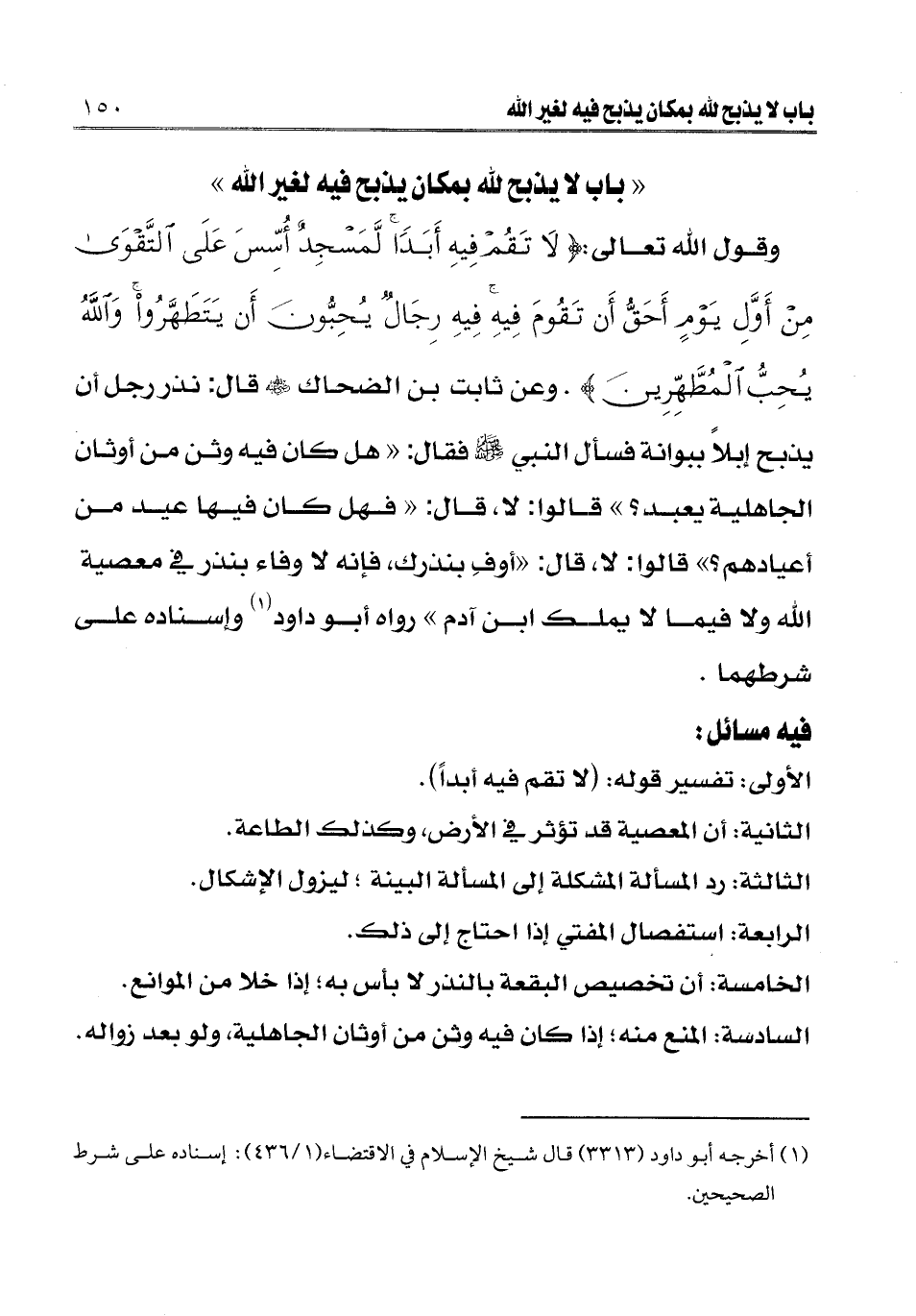" باب لا يذبح لله بمكان يذبح فيه لغير الله " وقوله تعالى: {لَا تَقُمْ فِيهِ أَبَدًا لَمَسْجِدٌ أُسِّسَ عَلَى التَّقْوَى مِنْ أَوَّلِ يَوْمٍ أَحَقُّ أَنْ تَقُومَ فِيهِ فِيهِ رِجَالٌ يُحِبُّونَ أَنْ يَتَطَهَّرُوا وَاللَّهُ يُحِبُّ الْمُطَّهِّرِينَ} [التوبة: 108] وعن ثابت بن الضحاك رضي الله عنه قال: «نذر رجل أن يذبح إبلا ببوانة فسأل النبي صلى الله عليه وسلم فقال: " هل كان فيه وثن من أوثان الجاهلية يعبد؟ " قالوا: لا، قال " فهل كان فيها عيد من أعيادهم؟ " قالوا: لا، قال: " أوف بنذرك فإنه لا وفاء بنذر في معصية الله ولا فيما لا يملك ابن آدم» رواه أبو داود (¬1) وإسناده على شرطهما.