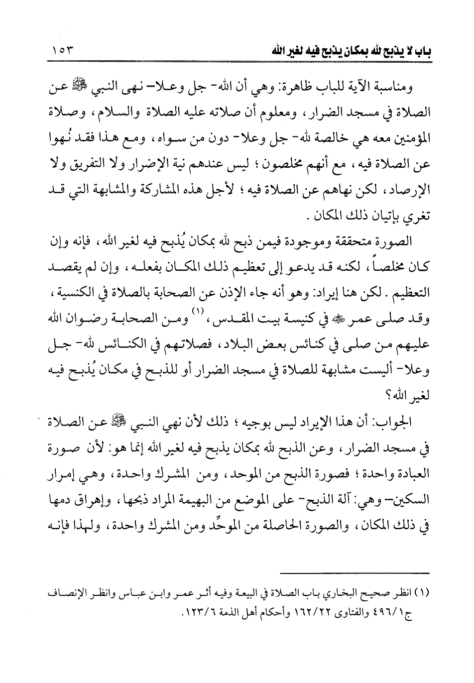 الصورة متحققة وموجودة فيمن ذبح لله بمكان يذبح فيه لغير الله، فإنه وإن كان مخلصا، لكنه قد يدعو إلى تعظيم ذلك المكان بفعله، وإن لم يقصد التعظيم. لكن هنا إيراد: وهو أنه جاء الإذن عن الصحابة بالصلاة في الكنيسة، وقد صلى عمر رضي الله عنه في كنيسة بيت المقدس (¬1) ومن الصحابة رضوان الله عليهم من صلى في كنائس بعض البلاد فصلاتهم في الكنائس لله - جل وعلا - أليست مشابهة للصلاة في مسجد الضرار أو للذبح في مكان يذبح فيه لغير الله؟