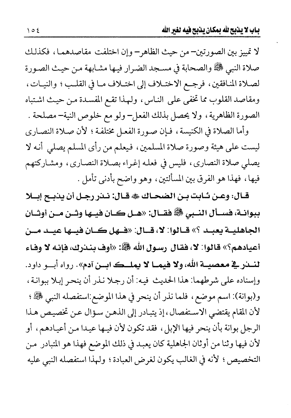 قال: وعن ثابت بن الضحاك رضي الله عنه قال: «نذر رجل أن يذبح إبلا ببوانة، فسأل النبي صلى الله عليه وسلم فقال: " هل كان فيها وثن من أوثان الجاهلية يعبد "؟ قالوا: لا، قال: فهل كان فيها عيد من أعيادهم؟ ، قالوا: لا، فقال رسول الله صلى الله عليه وسلم: " أوفِ بنذرك، فإنه لا وفاء لنذر في معصية الله، ولا فيما لا يملك ابن آدم» . رواه أبو داود.