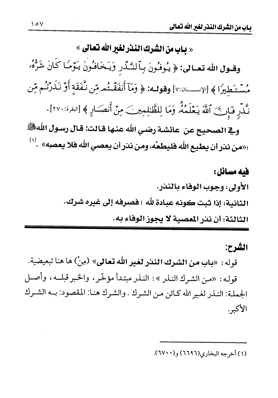 " باب من الشرك النذر لغير الله تعالى " وقول الله تعالى: {يُوفُونَ بِالنَّذْرِ وَيَخَافُونَ يَوْمًا كَانَ شَرُّهُ مُسْتَطِيرًا} [الإنسان: 7] [الإنسان: 7] وقوله: {وَمَا أَنْفَقْتُمْ مِنْ نَفَقَةٍ أَوْ نَذَرْتُمْ مِنْ نَذْرٍ فَإِنَّ اللَّهَ يَعْلَمُهُ وَمَا لِلظَّالِمِينَ مِنْ أَنْصَارٍ} [البقرة: 270] [البقرة: 270] .