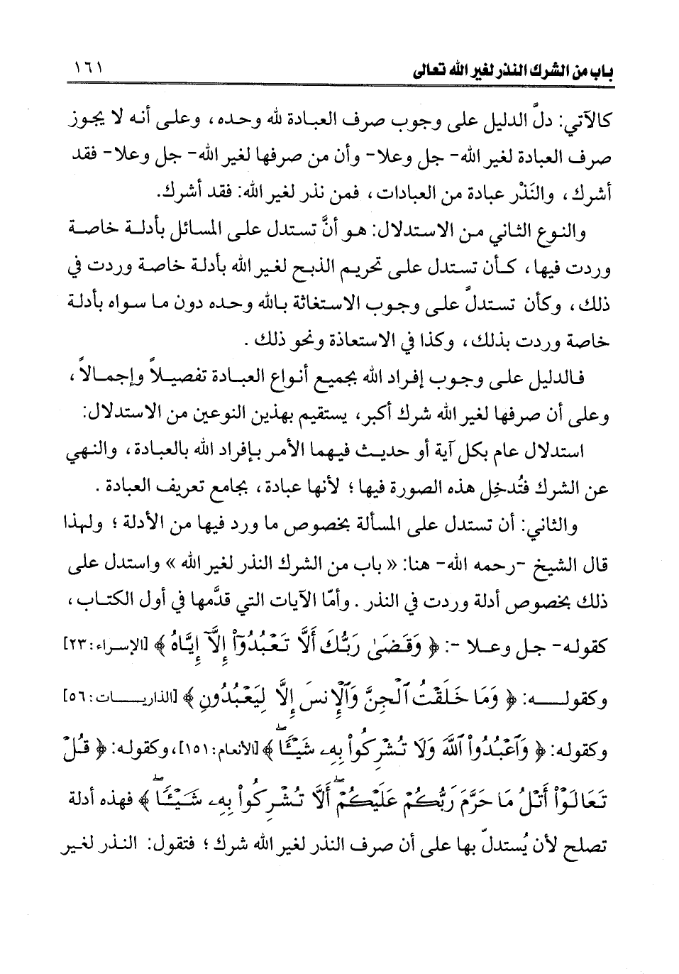 والثاني: أن تستدل على المسألة بخصوص ما ورد فيها من الأدلة؛ ولهذا قال الشيخ - رحمه الله - هنا: " باب من الشرك النذر لغير الله " واستدل على ذلك بخصوص أدلة وردت في النذر. وأما الآيات التي قدمها في أول الكتاب، كقوله - جل وعلا: {وَقَضَى رَبُّكَ أَلَّا تَعْبُدُوا إِلَّا إِيَّاهُ} [الإسراء: 23] [الإسراء: 23] وكقوله: {وَمَا خَلَقْتُ الْجِنَّ وَالْإِنْسَ إِلَّا لِيَعْبُدُونِ} [الذاريات: 56] [الذاريات: 56] وكقوله: {وَاعْبُدُوا اللَّهَ وَلَا تُشْرِكُوا بِهِ شَيْئًا} [النساء: 36] [الأنعام: 151] وكقوله: {قُلْ تَعَالَوْا أَتْلُ مَا حَرَّمَ رَبُّكُمْ عَلَيْكُمْ أَلَّا تُشْرِكُوا بِهِ شَيْئًا} [الأنعام: 151] فهذه أدلة تصلح لأن يستدل بها على أن صرف النذر لغير الله شرك؛ فتقول: النذر لغير