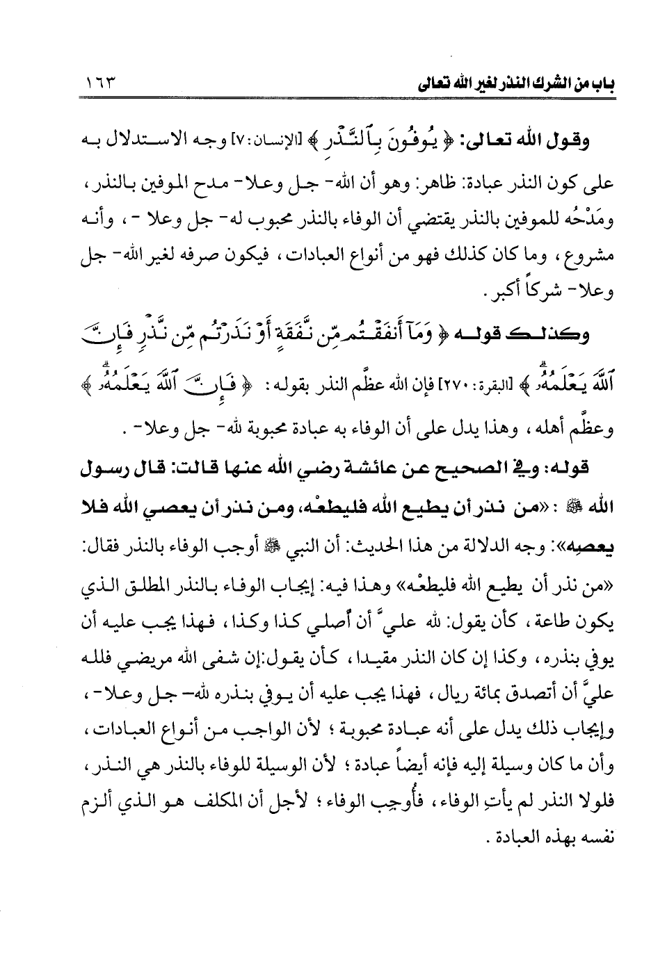 قوله: وفي الصحيح عن عائشة رضي الله عنها قالت: قال رسول الله صلى الله عليه وسلم: «من نذر أن يطيع الله فليطعه، ومن نذر أن يعصي الله فلا يعصه» : وجه الدلالة من هذا الحديث: أن النبي صلى الله عليه وسلم أوجب الوفاء بالنذر فقال: «من نذر أن يطيع الله فليطعه» وهذا فيه إيجاب الوفاء بالنذر المطلق الذي يكون طاعة، كأن يقول: لله على أن أصلي كذا وكذا، فهذا يجب عليه أن يوفي بنذره، وكذا إن كان النذر مقيدا، كأن يقول: إن شفى الله مريضي فلله علي أن أتصدق بمائة ريال، فهذا يجب عليه أن يوفي بنذره لله - جل وعلا -، وإيجاب ذلك يدل على أنه عبادة محبوبة؛ لأن الواجب من أنواع العبادات، وأن ما كان وسيلة إليه فإنه أيضا عبادة؛ لأن الوسيلة للوفاء بالنذر هي النذر، فلولا النذر لم يأت الوفاء، فأُوجب الوفاء؛ لأجل أن المكلف هو الذي ألزم نفسه بهذه العبادة.