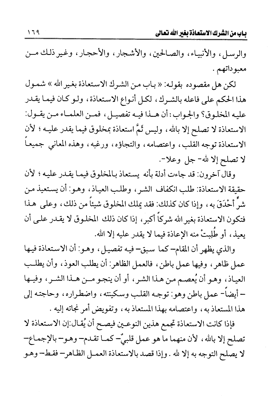لكن هل مقصوده بقوله: " باب من الشرك الاستعاذة بغير الله " شمول هذا الحكم على فاعله بالشرك، لكل أنواع الاستعاذة، ولو كان فيما يقدر عليه المخلوق؟ والجواب: أن هذا فيه تفصيل، فمن العلماء من يقول: الاستعاذة توجه القلب، واعتصامه، والتجاؤه، ورغبه، وهذه المعاني جميعا لا تصلح إلا لله - جل وعلا -.