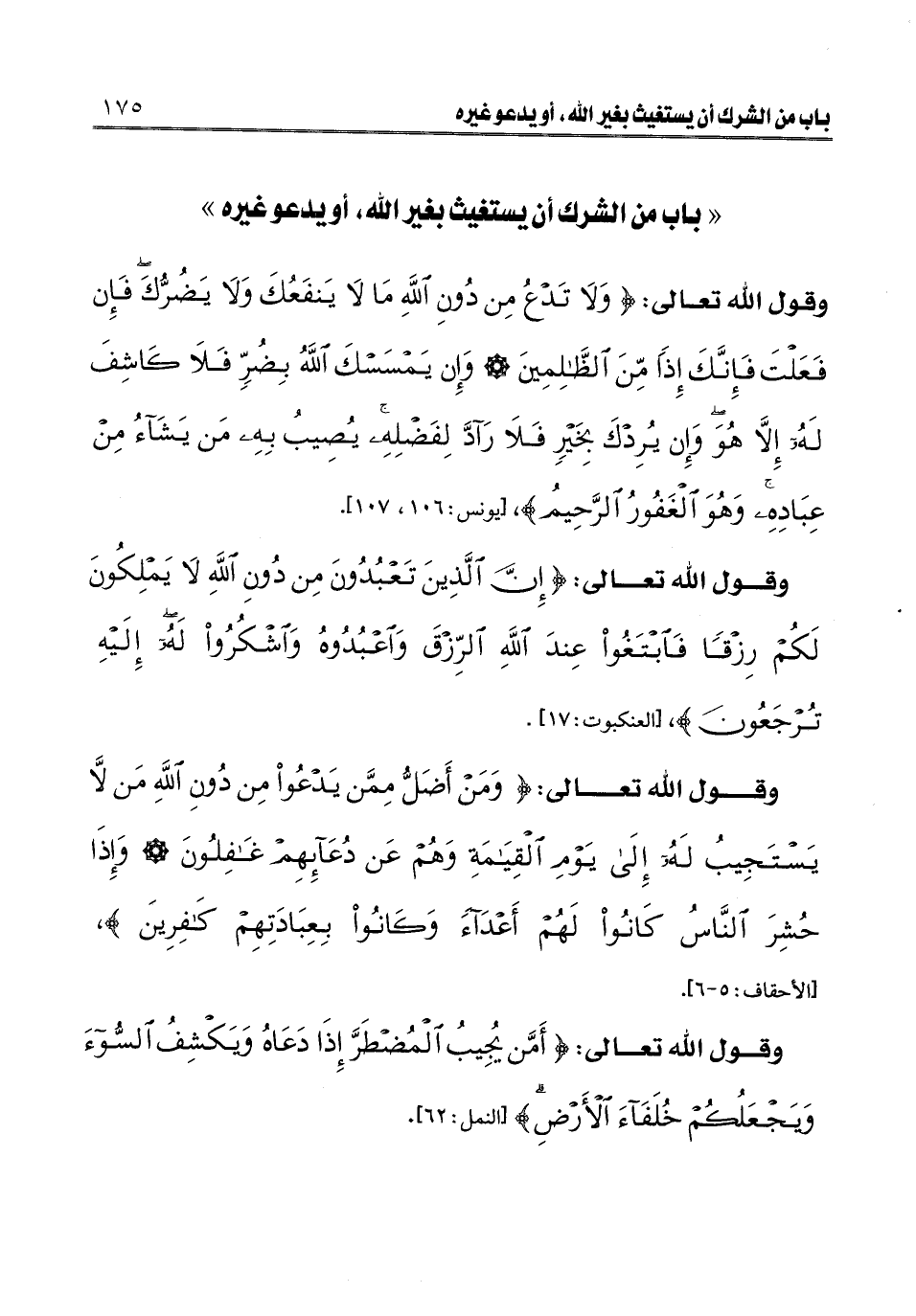 " باب من الشرك أن يستغيث بغير الله، أو يدعو غيره " وقول الله تعالى: {وَلَا تَدْعُ مِنْ دُونِ اللَّهِ مَا لَا يَنْفَعُكَ وَلَا يَضُرُّكَ فَإِنْ فَعَلْتَ فَإِنَّكَ إِذًا مِنَ الظَّالِمِينَ - وَإِنْ يَمْسَسْكَ اللَّهُ بِضُرٍّ فَلَا كَاشِفَ لَهُ إِلَّا هُوَ وَإِنْ يُرِدْكَ بِخَيْرٍ فَلَا رَادَّ لِفَضْلِهِ يُصِيبُ بِهِ مَنْ يَشَاءُ مِنْ عِبَادِهِ وَهُوَ الْغَفُورُ الرَّحِيمُ} [يونس: 106 - 107] [يونس: 106، 107] وقول الله تعالى: {إِنَّ الَّذِينَ تَعْبُدُونَ مِنْ دُونِ اللَّهِ لَا يَمْلِكُونَ لَكُمْ رِزْقًا فَابْتَغُوا عِنْدَ اللَّهِ الرِّزْقَ وَاعْبُدُوهُ وَاشْكُرُوا لَهُ إِلَيْهِ تُرْجَعُونَ} [العنكبوت: 17] [العنكبوت: 17] .
