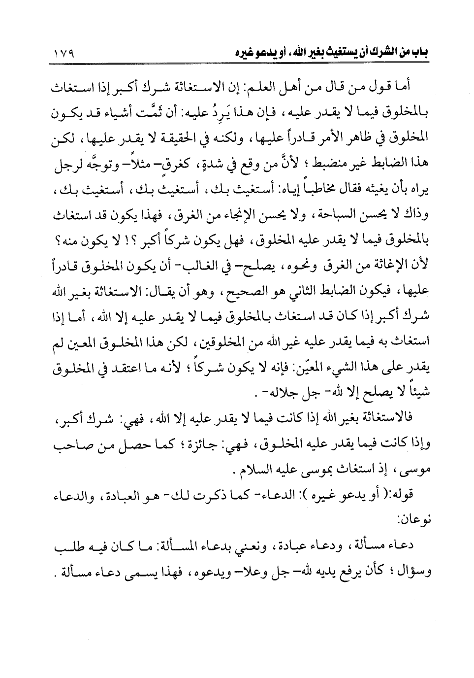 ـــــــــــــــــــــــــــــQأما قول من قال من أهل العلم: إن الاستغاثة شرك أكبر إذا استغاث بالمخلوق فيما لا يقدر عليه، فإن هذا يَرِد عليه: أن ثمت أشياء قد يكون المخلوق في ظاهر الأمر قادرا عليها، ولكنه في الحقيقة لا يقدر عليها، لكن هذا الضابط غير منضبط؛ لأن من وقع في شدة - كغرق مثلا - وتوجه لرجل يراه بأن يغيثه فقال مخاطبا إياه: أستغيث بك، أستغيث بك، أستغيث بك وذاك لا يحسن السباحة ولا يحسن الإنجاء من الغرق، فهذا يكون قد استغاث بالمخلوق فيما لا يقدر عليه المخلوق، فهل يكون شركا أكبر؟ لا يكون منه؟ لأن الإغاثة من الغرق ونحوه، يصلح - في الغالب - أن يكون المخلوق قادرا عليها فيكون الضابط الثاني هو الصحيح، وهو أن يقال: الاستغاثة بغير الله شرك أكبر إذا كان قد استغاث بالمخلوق فيما لا يقدر عليه إلا الله، أما إذا استغاث به فيما يقدر عليه غير الله من المخلوقين، لكن هذا المخلوق المعين لم يقدر على هذا الشيء المعيّن: فإنه لا يكون شركا؛ لأنه ما اعتقد في المخلوق شيئا لا يصلح إلا لله - جل جلاله -.