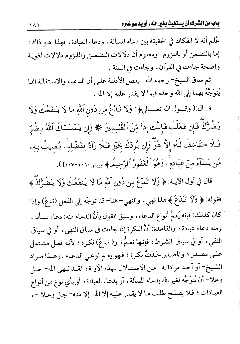 قال في أول الآية: {وَلَا تَدْعُ مِنْ دُونِ اللَّهِ مَا لَا يَنْفَعُكَ وَلَا يَضُرُّكَ} [يونس: 106] فقوله: {وَلَا تَدْعُ} [يونس: 106] هذا نهي، والنهي هنا قد توجه إلى الفعل (تدع) وإذا كان كذلك: فإنه يعم أنواع الدعاء، وسبق القول بأن الدعاء منه: دعاء مسألة، ومنه دعاء عبادة؛ والقاعدة: أن النكرة إذا جاءت في سياق النهي، أو في سياق النفي، أو في سياق الشرط: فإنها تعم؛ و (تدع) نكرة؛ لأنه فعل مشتمل على مصدر؛ والمصدر حَدَثٌ نكرة؛ فهو يعم نوعي الدعاء. وهذا مراد الشيخ - أو أحد مراداته - من الاستدلال بهذه الآية، فقد نهى الله - جل وعلا - أن يُتوجه لغير الله بدعاء المسألة، أو بدعاء العبادة، أو بأي نوع من أنواع العبادات؛ فلا يصلح طلب ما يقدر عليه إلا الله: إلا منه جل وعلا،