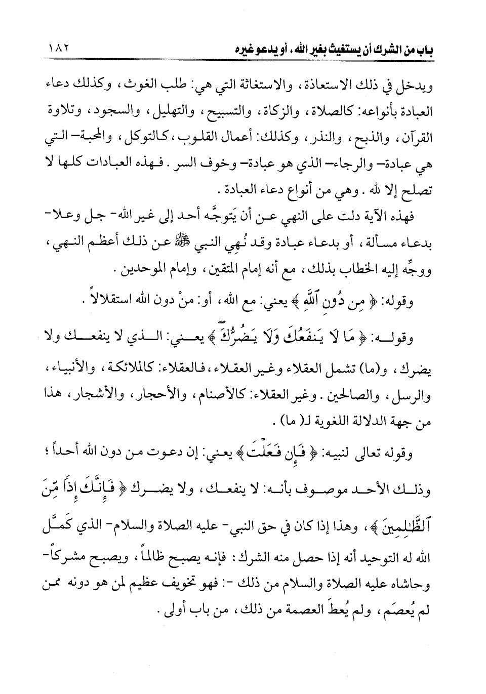 ـــــــــــــــــــــــــــــQويدخل في ذلك الاستعاذة، والاستغاثة التي هي: طلب الغوث، وكذلك دعاء العبادة بأنواعه: كالصلاة، والزكاة، والتسبيح، والتهليل، والسجود، وتلاوة القرآن، والذبح، والنذر، وكذلك: أعمال القلوب، كالتوكل، والمحبة التي هي عبادة والرجاء الذي هو عبادة وخوف السر. فهذه العبادات كلها لا تصلح إلا لله. وهي من أنواع دعاء العبادة.