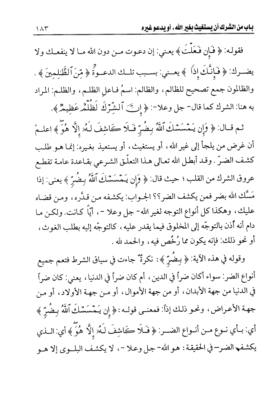 وقوله في هذه الآية: {بِضُرٍّ} [يونس: 107] نكرة جاءت في سياق الشرط فتعم جميع أنواع الضر: سواء أكان ضرا في الدين، أم كان ضرا في الدنيا، يعني: كان ضرا في الدنيا من جهة الأبدان، أو من جهة الأموال، أو من جهة الأولاد، أو من جهة الأعراض، ونحو ذلك إذًا: فمعنى قوله: {وَإِنْ يَمْسَسْكَ اللَّهُ بِضُرٍّ} [يونس: 107] أي بأي نوع من أنواع الضر: {فَلَا كَاشِفَ لَهُ إِلَّا هُوَ} [يونس: 107] أي: الذي يكشف الضر في الحقيقة: هو الله - جل وعلا -، لا يكشف البلوى إلا هو