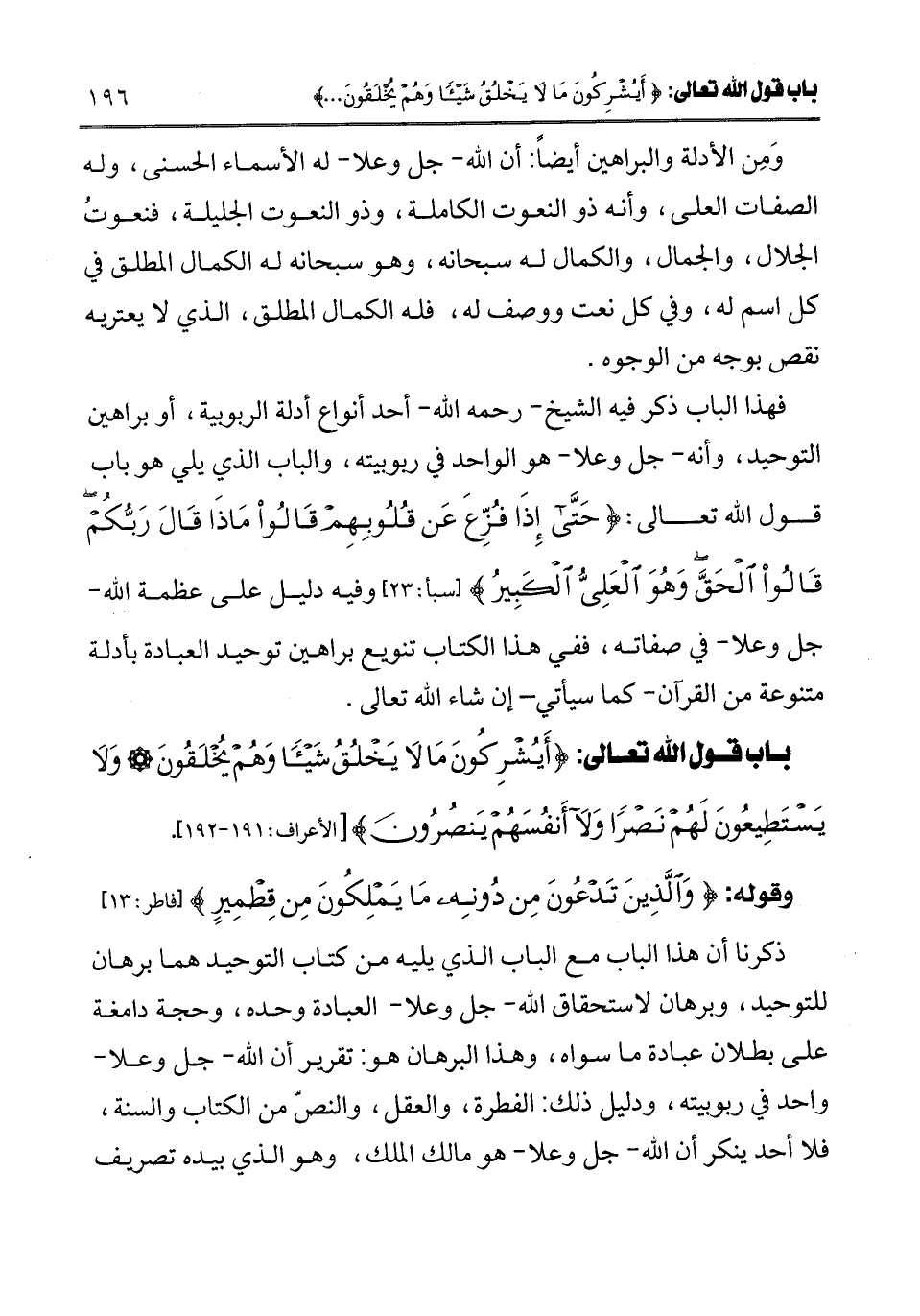 فهذا الباب ذكر فيه الشيخ - رحمه الله - أحد أنواع أدلة الربوبية، أو براهين التوحيد، وأنه - جل وعلا - هو الواحد في ربوبيته، والباب الذي يلي هو باب قول الله تعالى: {حَتَّى إِذَا فُزِّعَ عَنْ قُلُوبِهِمْ قَالُوا مَاذَا قَالَ رَبُّكُمْ قَالُوا الْحَقَّ وَهُوَ الْعَلِيُّ الْكَبِيرُ} [سبأ: 23] [سبأ: 23] ، وفيه دليل على عظمة الله - جل وعلا - في صفاته، ففي هذا الكتاب تنويع براهين توحيد العبادة بأدلة متنوعة من القرآن - كما سيأتي - إن شاء الله تعالى.