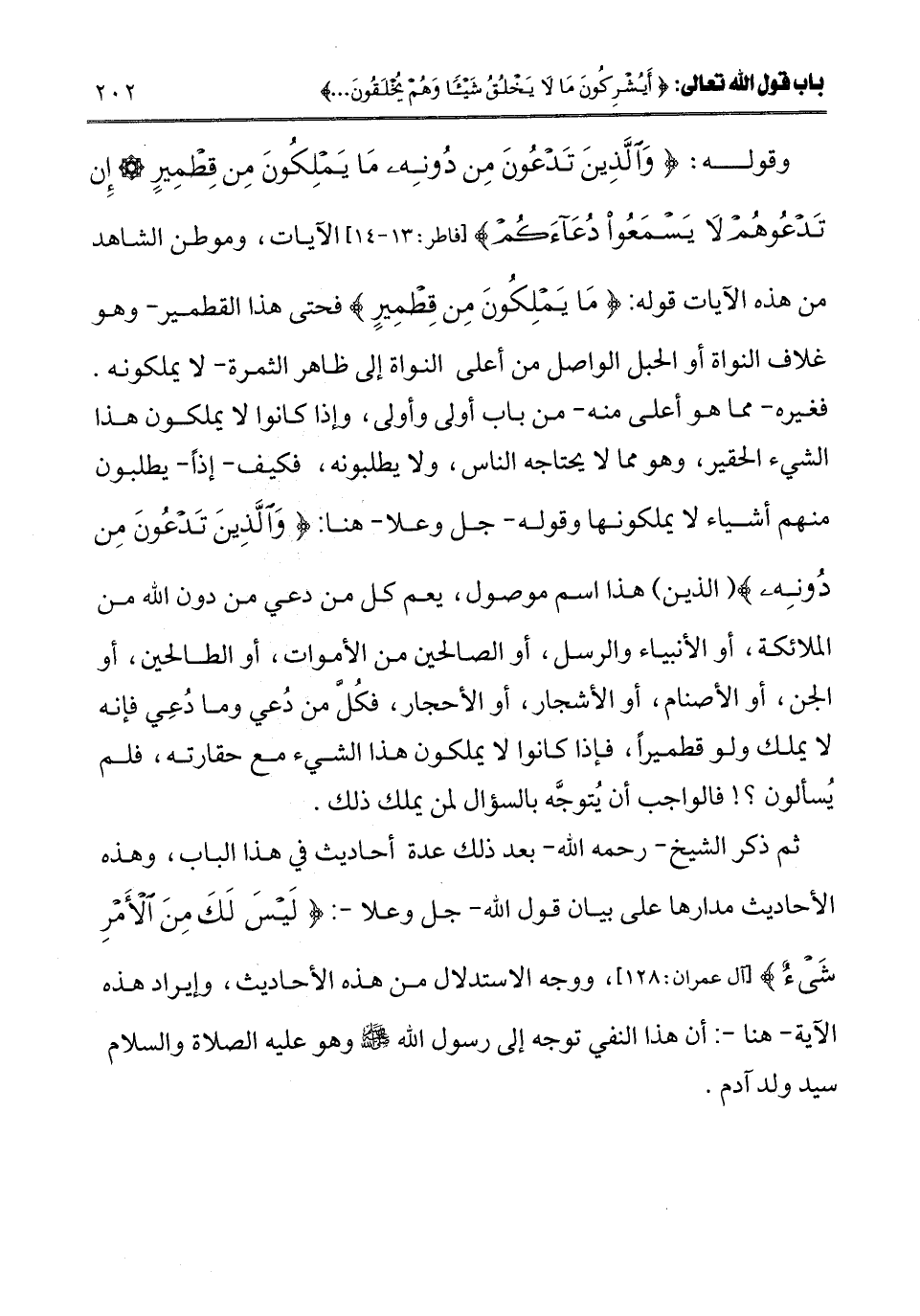 ـــــــــــــــــــــــــــــQوقوله: {وَالَّذِينَ تَدْعُونَ مِنْ دُونِهِ مَا يَمْلِكُونَ مِنْ قِطْمِيرٍ - إِنْ تَدْعُوهُمْ لَا يَسْمَعُوا دُعَاءَكُمْ} [فاطر: 13 - 14] [فاطر: 13 - 14] الآيات، وموطن الشاهد من هذه الآيات قوله: {مَا يَمْلِكُونَ مِنْ قِطْمِيرٍ} [فاطر: 13] فحتى هذا القطمير وهو غلاف النواة أو الحبل الواصل من أعلى النواة إلى ظاهر الثمرة لا يملكونه.