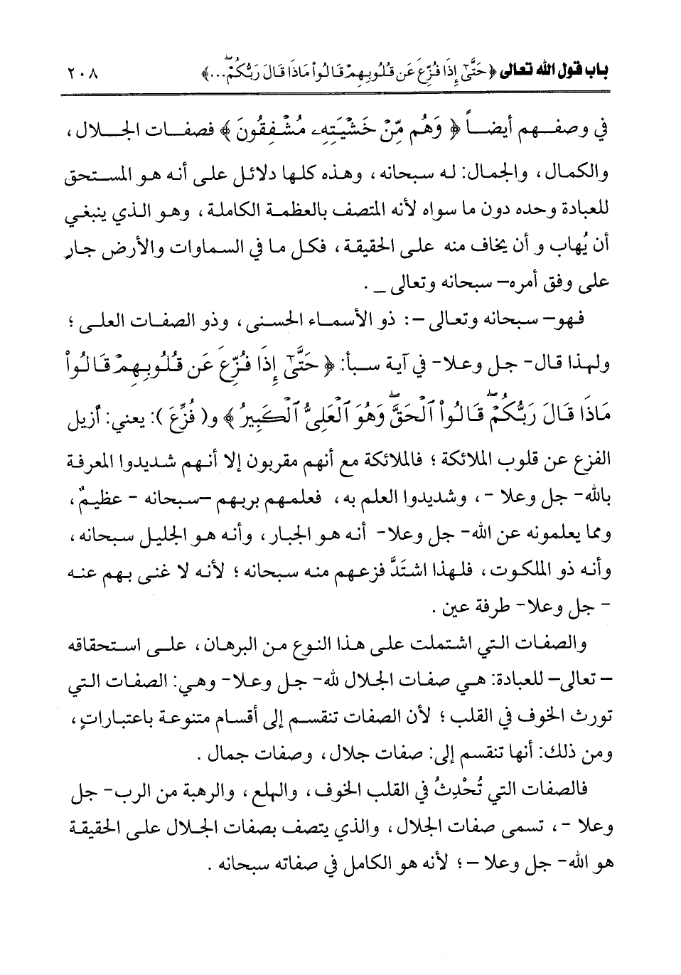 فهو سبحانه وتعالى: ذو الأسماء الحسنى، وذو الصفات العلى؛ ولهذا قال - جل وعلا - في آية سبأ: {حَتَّى إِذَا فُزِّعَ عَنْ قُلُوبِهِمْ قَالُوا مَاذَا قَالَ رَبُّكُمْ قَالُوا الْحَقَّ وَهُوَ الْعَلِيُّ الْكَبِيرُ} [سبأ: 23] و (فزع) : يعني أزيل الفزع عن قلوب الملائكة؛ فالملائكة مع أنهم مقربون إلا أنهم شديدوا المعرفة بالله جل وعلا، وشديدوا العلم به، فعلمهم بربهم سبحانه عظيم، ومما يعلمونه عن الله - جل وعلا - أنه هو الجبار، وأنه هو الجليل سبحانه، وأنه ذو الملكوت، فلهذا اشتد فزعهم منه سبحانه؛ لأنه لا غنى بهم عنه - جل وعلا - طرفة عين.