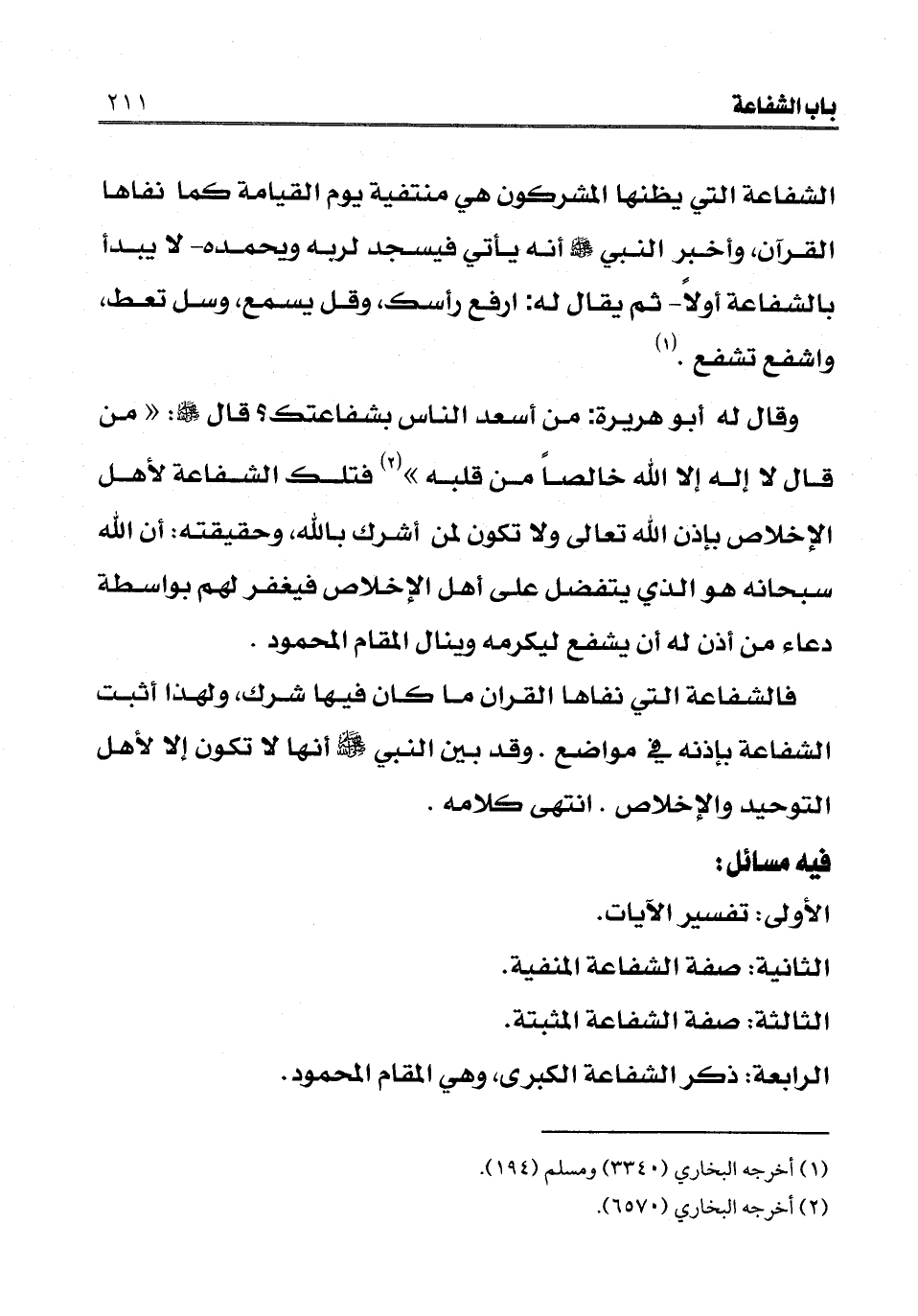 الشفاعة التي يظنها المشركون هي منتفية يوم القيامة كما نفاها القرآن، «وأخبر النبي صلى الله عليه وسلم أنه يأتي فيسجد لربه ويحمده لا يبدأ بالشفاعة أولا ثم يقال له: ارفع رأسك وقل يسمع، وسل تعط، واشفع تشفع» (¬1) «وقال له أبو هريرة: من أسعد الناس بشفاعتك قال صلى الله عليه وسلم " من قال لا إله إلا الله خالصا من قلبه» (¬2) فتلك الشفاعة لأهل الإخلاص بإذن الله تعالى ولا تكون لمن أشرك بالله، وحقيقته: أن الله سبحانه هو الذي يتفضل على أهل الإخلاص فيغفر لهم بواسطة دعاء من أذن له أن يشفع ليكرمه وينال المقام المحمود.
