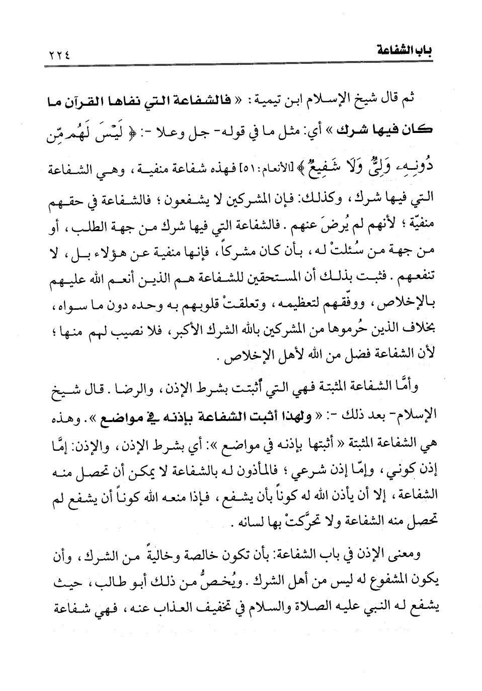 ـــــــــــــــــــــــــــــQثم قال شيخ الإسلام ابن تيمية: " فالشفاعة التي نفاها القرآن ما كان فيها شرك " أي: مثل ما في قوله جل وعلا: {لَيْسَ لَهُمْ مِنْ دُونِهِ وَلِيٌّ وَلَا شَفِيعٌ} [الأنعام: 51] [الأنعام: 51] فهذه شفاعة منفية، وهي الشفاعة التي فيها شرك، وكذلك: فإن المشركين لا يشفعون؛ فالشفاعة في حقهم منفية؛ لأنهم لم يرض عنهم. فالشفاعة التي فيها شرك من جهة الطلب، أو من جهة من سئلت له، بأن كان مشركا، فإنها منفية عن هؤلاء، بل لا تنفعهم. فثبت بذلك أن المستحقين للشفاعة هم الذين أنعم الله عليهم بالإخلاص، ووفقهم لتعظيمه، وتعلقت قلوبهم به وحده دون ما سواه؛ بخلاف الذين حرموها من المشركين بالله الشرك الأكبر، فلا نصيب لهم منها؛ لأن الشفاعة فضل من الله لأهل الإخلاص.
