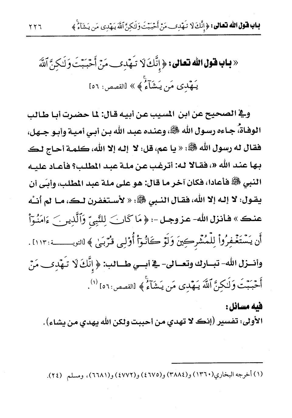 فيه مسائل: الأولى: تفسير: {إِنَّكَ لَا تَهْدِي مَنْ أَحْبَبْتَ وَلَكِنَّ اللَّهَ يَهْدِي مَنْ يَشَاءُ} [القصص: 56]
