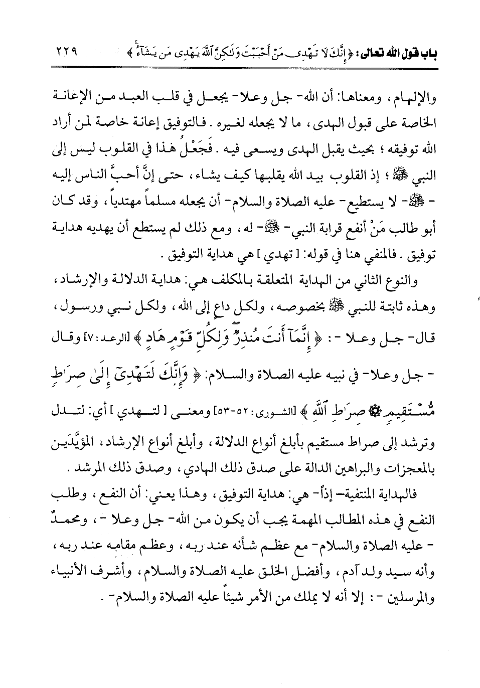 ـــــــــــــــــــــــــــــQوالإلهام، ومعناها: أن الله - جل وعلا - يجعل في قلب العبد من الإعانة الخاصة على قبول الهدى، ما لا يجعله لغيره. فالتوفيق إعانة خاصة لمن أراد الله توفيقه؛ بحيث يقبل الهدى ويسعى فيه. فجعل هذا في القلوب ليس إلى النبي صلى الله عليه وسلم؛ إذ القلوب بيد الله يقلبها كيف يشاء، حتى إن أحب الناس إليه صلى الله عليه وسلم لا يستطيع - عليه الصلاة والسلام - أن يجعله مسلما مهتديا، وقد كان أبو طالب من أنفع قرابة النبي صلى الله عليه وسلم له، ومع ذلك لم يستطع أن يهديه هداية توفيق. فالمنفي هنا في قوله: [تهدي] هي هداية التوفيق.