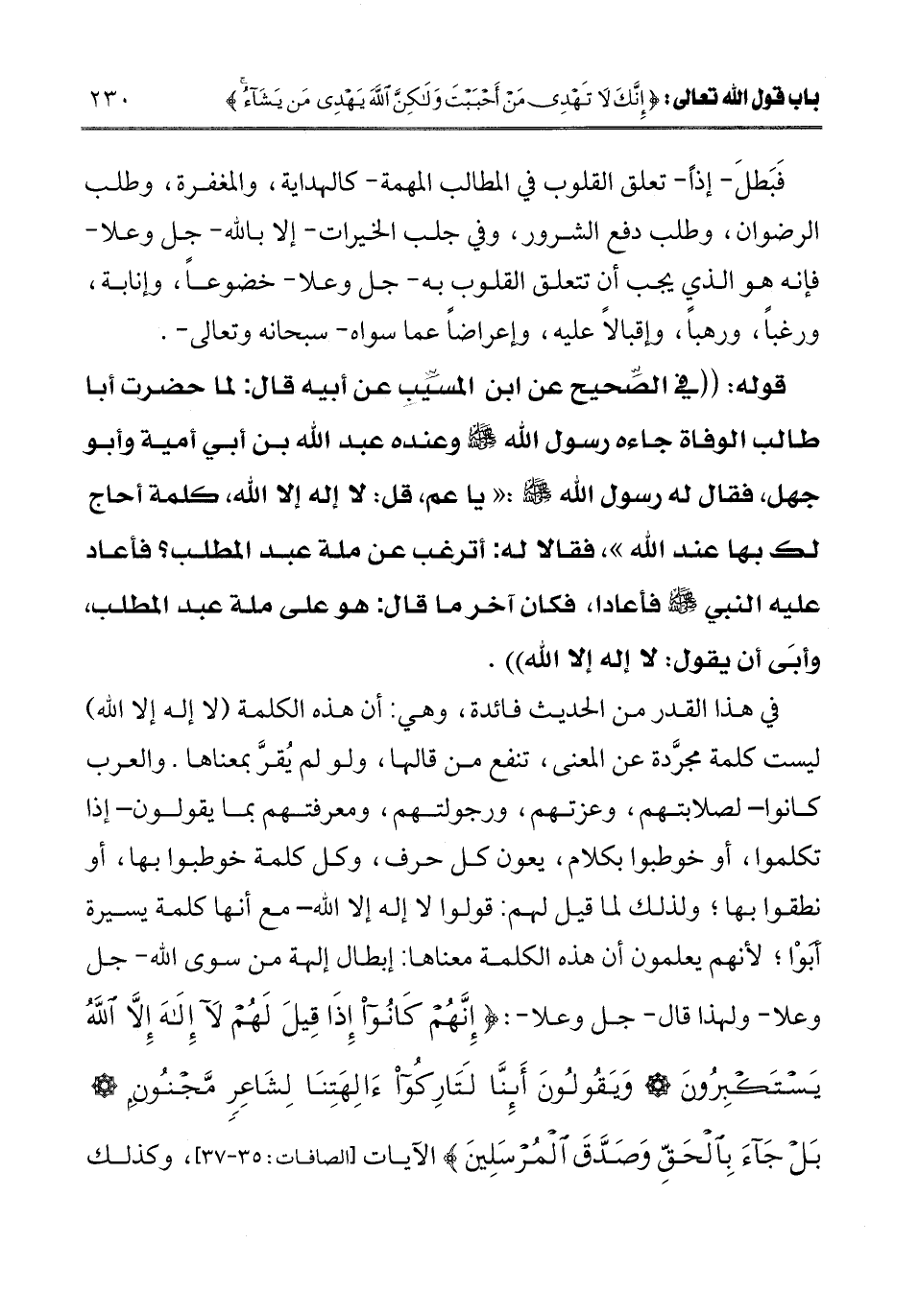 قوله: " في الصحيح عن ابن المسيب عن أبيه قال: «لما حضرت أبا طالب الوفاة جاءه رسول الله صلى الله عليه وسلم وعنده عبد الله بن أبي أمية وأبو جهل، فقال له رسول الله صلى الله عليه وسلم: " يا عم قل: لا إله إلا الله، كلمة أحاج لك بها عند الله "، فقالا له: أترغب عن ملة عبد المطلب؟ فأعاد عليه النبي صلى الله عليه وسلم فأعادا، فكان آخر ما قال: هو على ملة عبد المطلب، وأبى أن يقول: لا إله إلا الله» .
