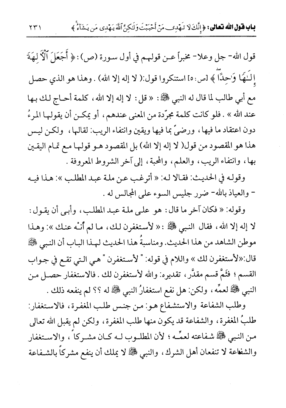 ـــــــــــــــــــــــــــــQقول الله - جل وعلا - مخبرا عن قولهم في أول سورة (ص) : {أَجَعَلَ الْآلِهَةَ إِلَهًا وَاحِدًا} [ص: 5] [ص: 5] استنكروا قول: (لا إله إلا الله) . وهذا هو الذي حصل مع أبي طالب لما قال له النبي صلى الله عليه وسلم: «قل: لا إله إلا الله، كلمة أحاج لك بها عند الله» . فلو كانت كلمة مجردة من المعنى عندهم، أو يمكن أن يقولها المرء دون اعتقاد ما فيها، ورضى بما فيها ويقين وانتفاء الريب: لقالها، ولكن ليس هذا هو المقصود من قول (لا إله إلا الله) ، بل المقصود هو قولها مع تمام اليقين بها، وانتفاء الريب، والعلم، والمحبة، إلى آخر الشروط المعروفة.