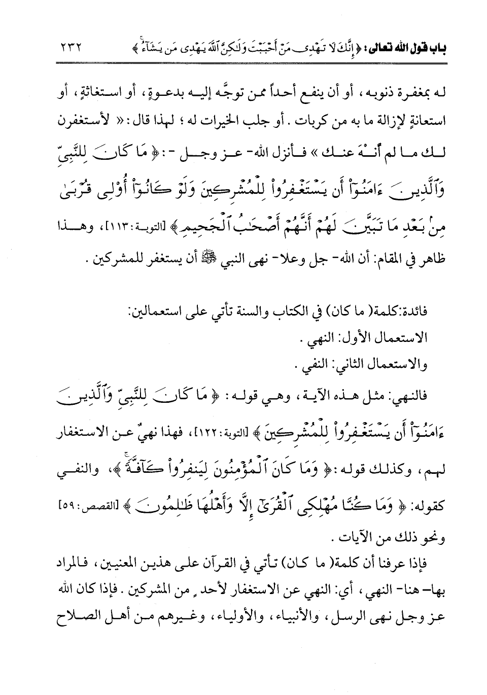 فإذا عرفنا أن كلمة (ما كان) تأتي في القرآن على هذين المعنيين، فالمراد بها - هنا - النهي، أي: النهي عن الاستغفار لأحد من المشركين. فإذا كان الله عز وجل نهى الرسل، والأنبياء، والأولياء، وغيرهم من أهل الصلاح