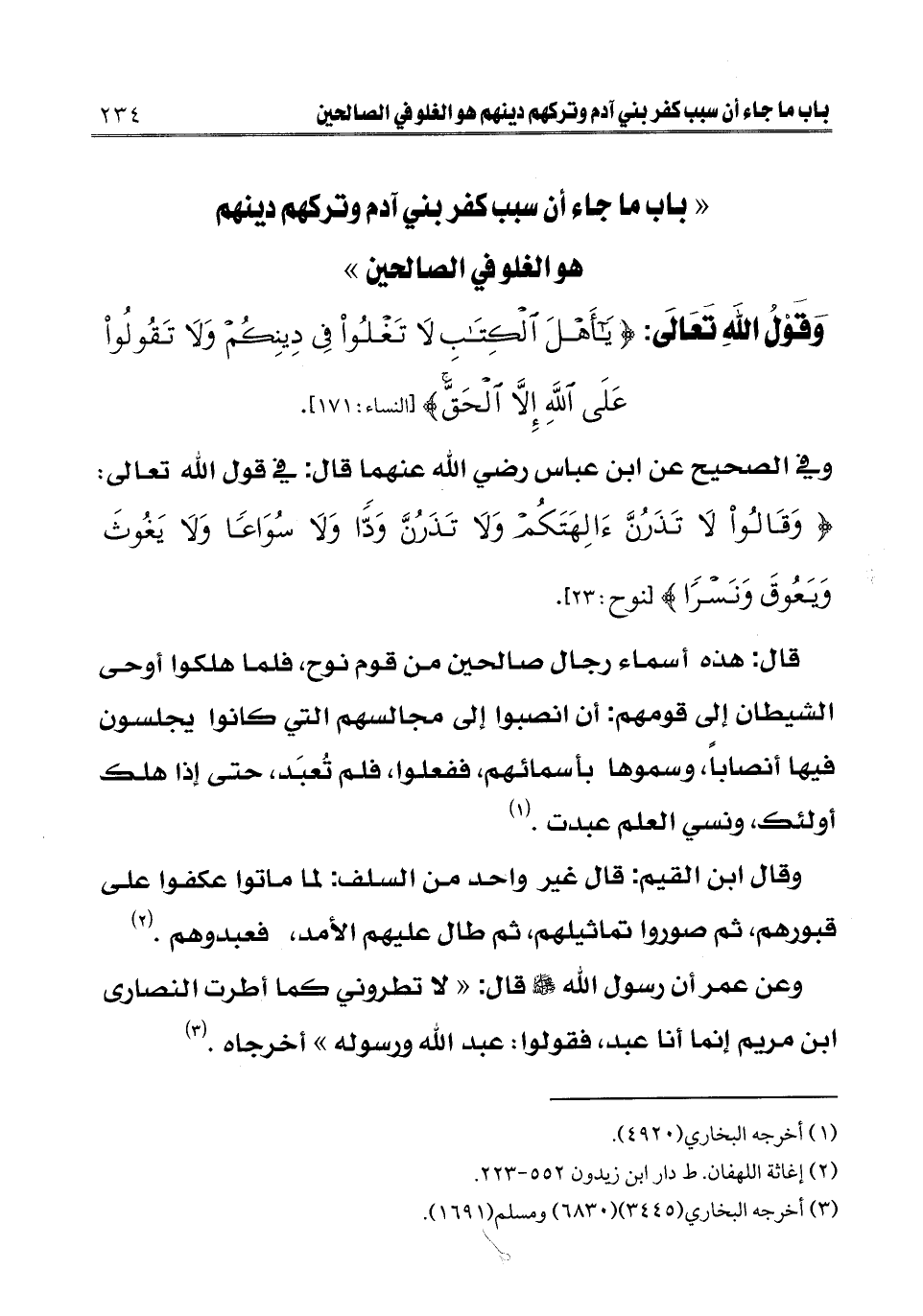 " باب ما جاء أن سبب كفر بني آدم وتركهم دينهم هو الغلو في الصالحين " وقول الله تعالى: {يَا أَهْلَ الْكِتَابِ لَا تَغْلُوا فِي دِينِكُمْ وَلَا تَقُولُوا عَلَى اللَّهِ إِلَّا الْحَقَّ} [النساء: 171] [النساء 171] .