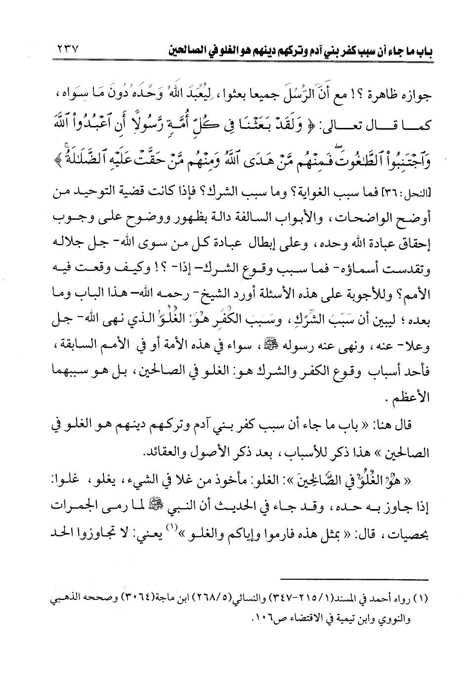 ـــــــــــــــــــــــــــــQجوازه ظاهرة؟ مع أن الرسل جميعا بعثوا، ليعبد الله وحده دون ما سواه، كما قال تعالى: {وَلَقَدْ بَعَثْنَا فِي كُلِّ أُمَّةٍ رَسُولًا أَنِ اُعْبُدُوا اللَّهَ وَاجْتَنِبُوا الطَّاغُوتَ فَمِنْهُمْ مَنْ هَدَى اللَّهُ وَمِنْهُمْ مَنْ حَقَّتْ عَلَيْهِ الضَّلَالَةُ} [النحل: 36] [النحل: 36] ، فما سبب الغواية؟ وما سبب الشرك؟ فإذا كانت قضية التوحيد من أوضح الواضحات، والأبواب السالفة دالة بظهور ووضوح على وجوب إحقاق عبادة الله وحده، وعلى إبطال عبادة كل من سوى الله - جل جلاله وتقدست أسماؤه - فما سبب وقوع الشرك إذا؟ وكيف وقعت فيه الأمم؟ وللأجوبة على هذه الأسئلة أورد الشيخ - رحمه الله - هذا الباب وما بعده؛ ليبين أن سبب الشرك، وسبب الكفر هو: الغلو الذي نهى الله - جل وعلا - عنه، ونهى عنه رسوله صلى الله عليه وسلم، سواء في هذه الأمة أو في الأمم السابقة، فأحد أسباب وقوع الكفر والشرك هو: الغلو في الصالحين، بل هو سببهما الأعظم.