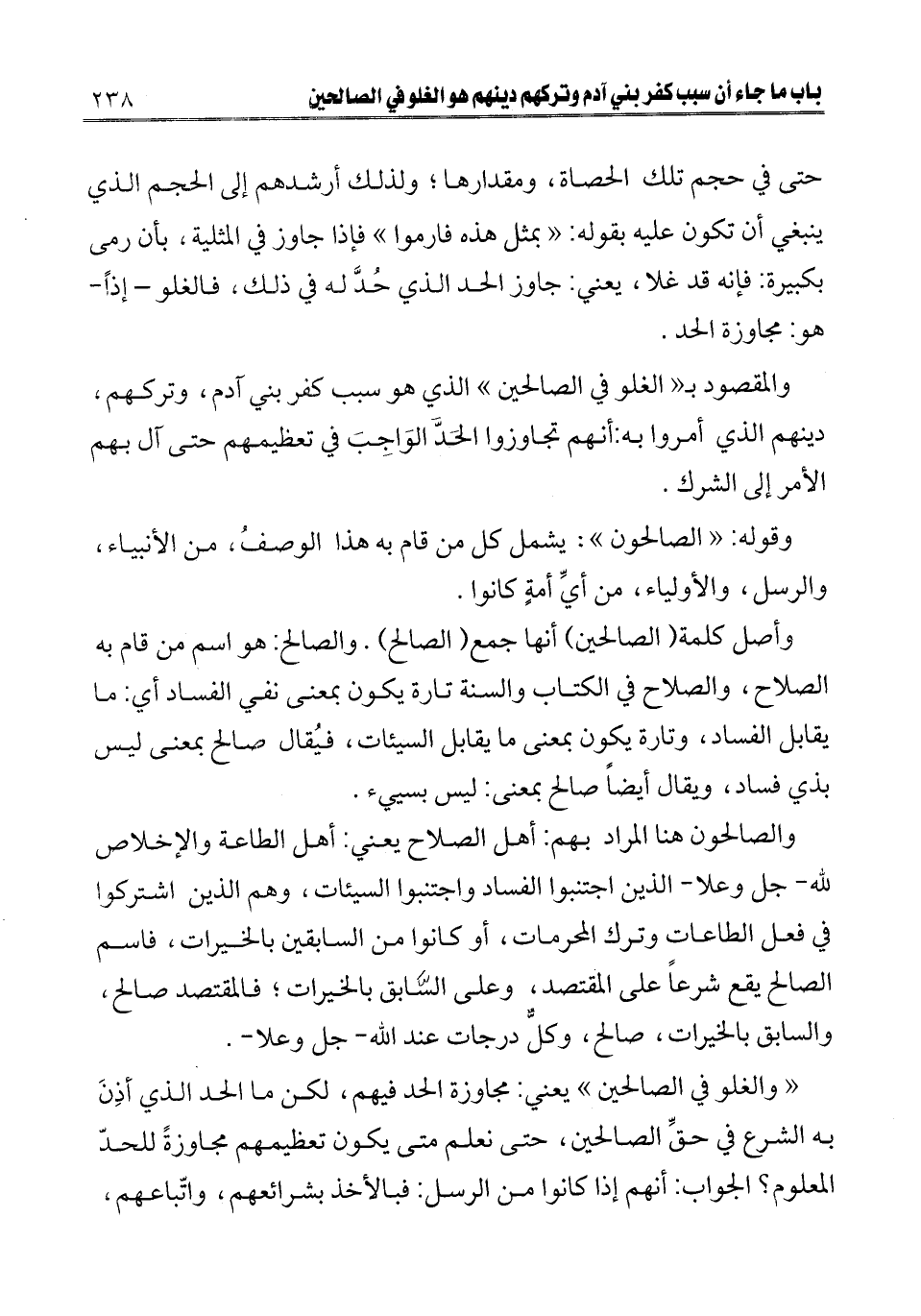 والمقصود بـ " الغلو في الصالحين " الذي هو سبب كفر بني آدم، وتركهم، دينهم الذي أمروا به: أنهم تجاوزوا الحد الواجب في تعظيمهم حتى آل بهم الأمر إلى الشرك.