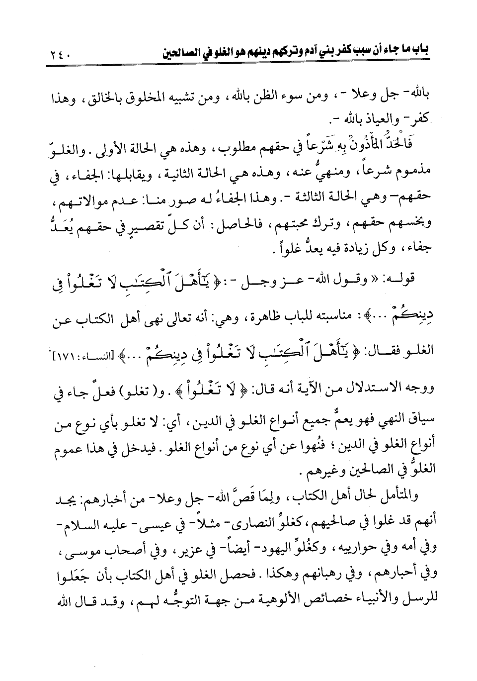 والمتأمل لحال أهل الكتاب، ولما قص الله - جل وعلا - من أخبارهم: يجد أنهم قد غلوا في صالحيهم، كغلو النصارى - مثلا - في عيسى - عليه السلام - وفي أمه وفي حوارييه، وكغلو اليهود - أيضا - في عزير، وفي أصحاب موسى، وفي أحبارهم، وفي رهبانهم وهكذا. فحصل الغلو في أهل الكتاب بأن جعلوا للرسل والأنبياء خصائص الألوهية من جهة التوجه لهم، وقد قال الله