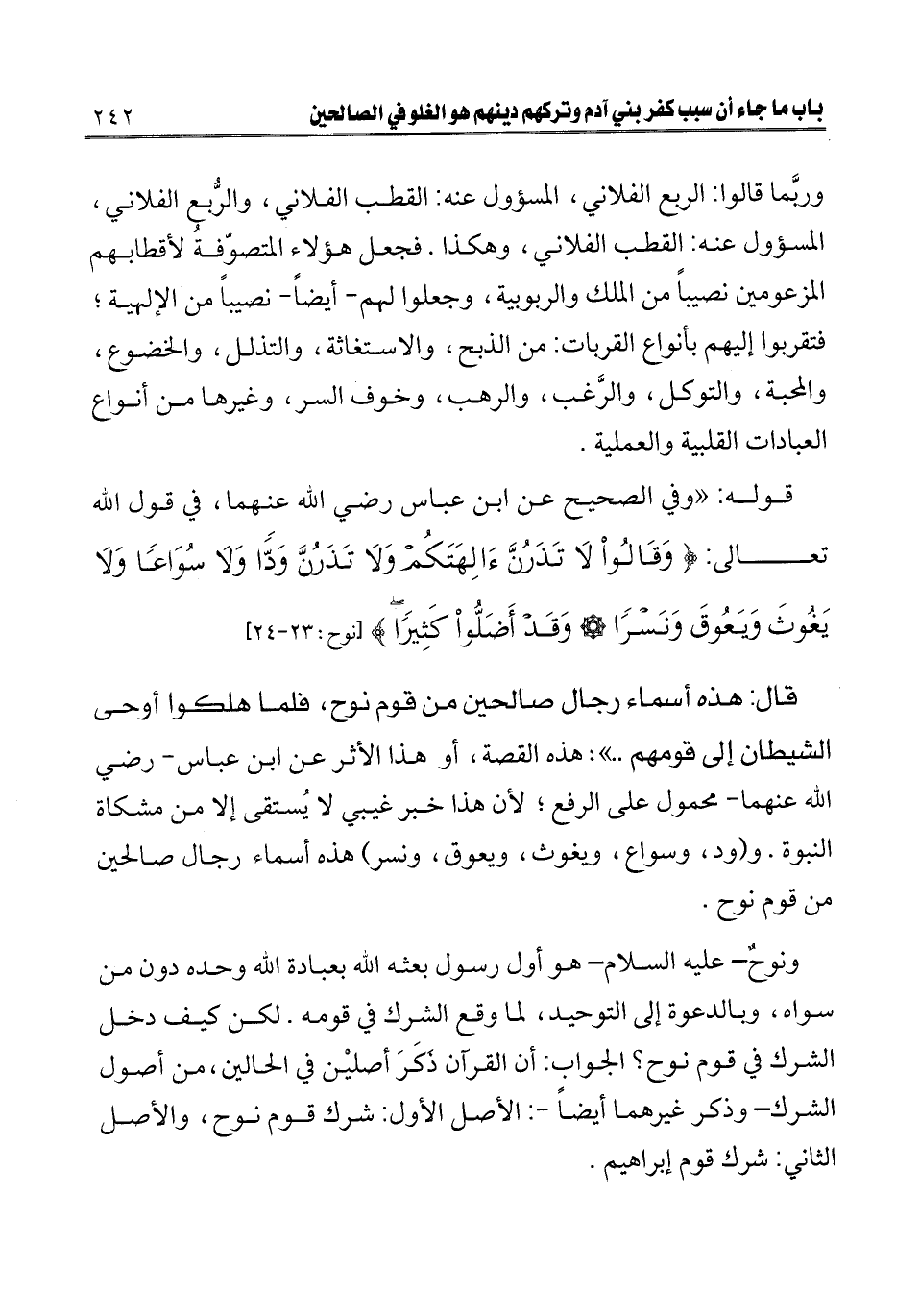 قوله: " وفي الصحيح عن ابن عباس رضي الله عنهما، في قول الله تعالى: {وَقَالُوا لَا تَذَرُنَّ آلِهَتَكُمْ وَلَا تَذَرُنَّ وَدًّا وَلَا سُوَاعًا وَلَا يَغُوثَ وَيَعُوقَ وَنَسْرًا - وَقَدْ أَضَلُّوا كَثِيرًا} [نوح: 23 - 24] [نوح 23 - 24] .