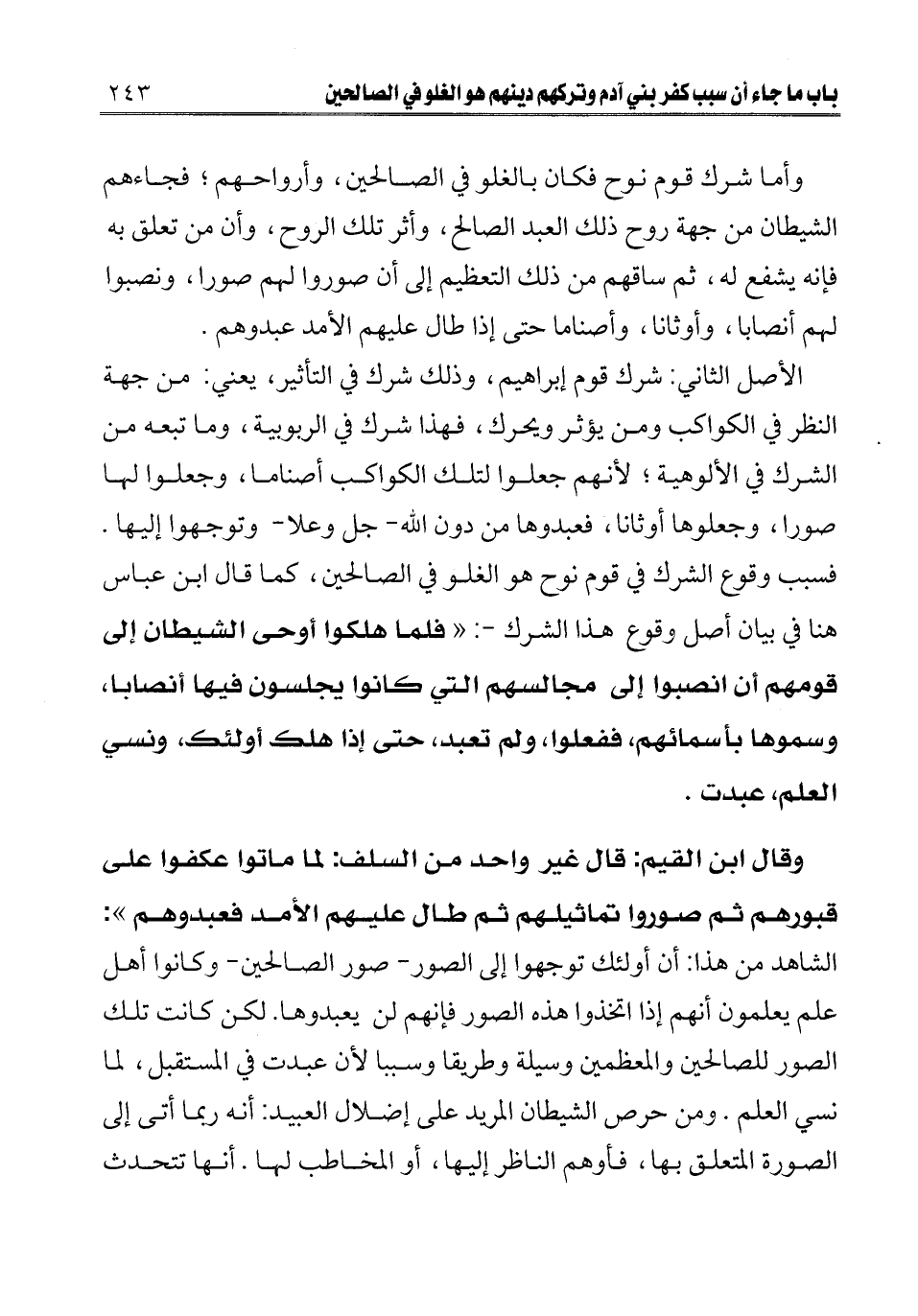 وقال ابن القيم: قال غير واحد من السلف: " لما ماتوا عكفوا على قبورهم ثم صوروا تماثيلهم ثم طال عليهم الأمد فعبدوهم ": الشاهد من هذا: أن أولئك توجهوا إلى الصور - صور الصالحين - وكانوا أهل علم يعلمون أنهم إذا اتخذوا هذه الصور فإنهم لن يعبدوها. لكن كانت تلك الصور للصالحين والمعظمين وسيلة وطريقا وسببا لأن عبدت في المستقبل، لما نسي العلم. ومن حرص الشيطان المريد على إضلال العبيد: أنه ربما أتى إلى الصورة المتعلق بها، فأوهم الناظر إليها، أو المخاطب لها. أنها تتحدث