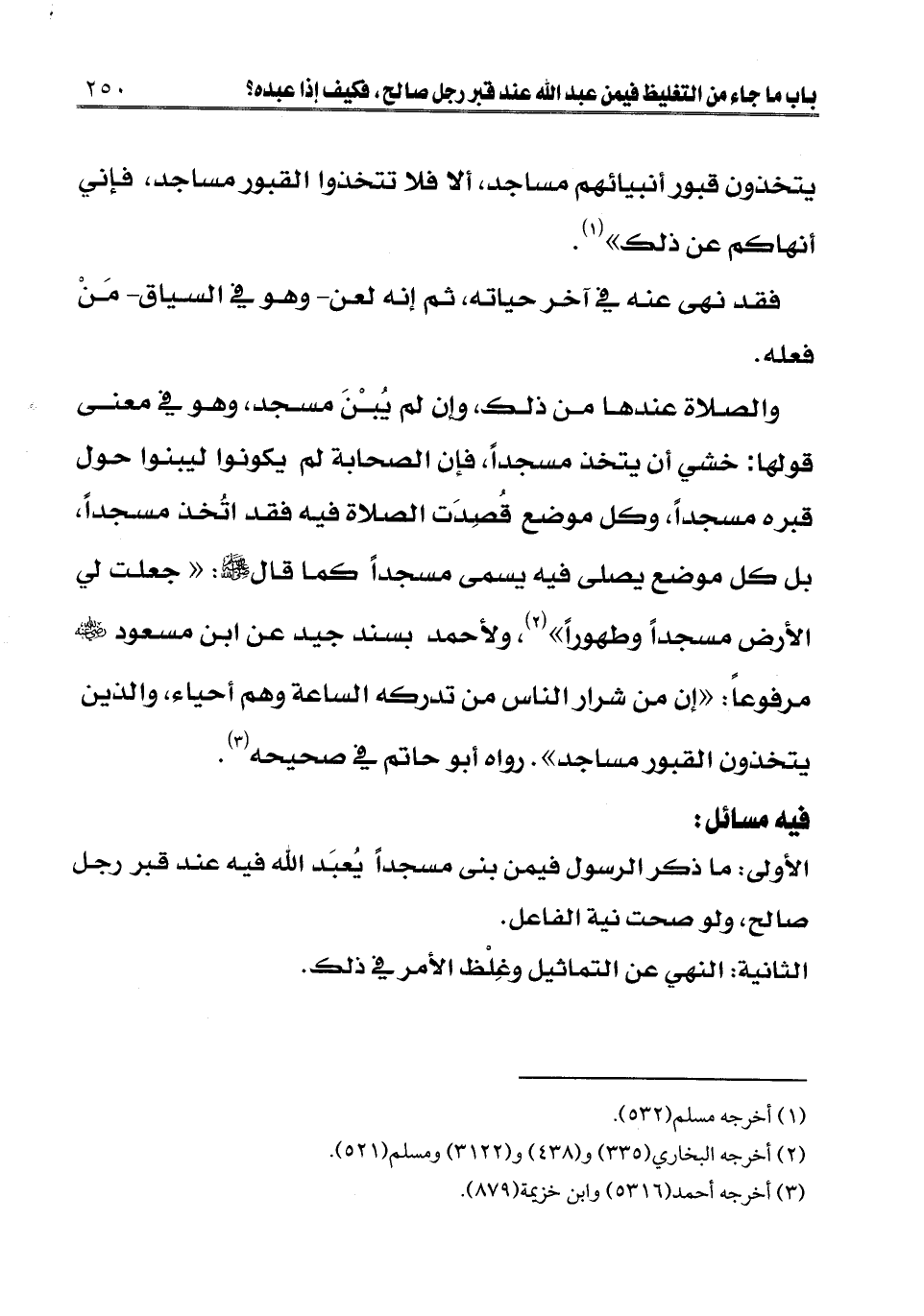 يتخذون قبور أنبيائهم مساجد، ألا فلا تتخذوا القبور مساجد، فإني أنهاكم عن ذلك» (¬1) .