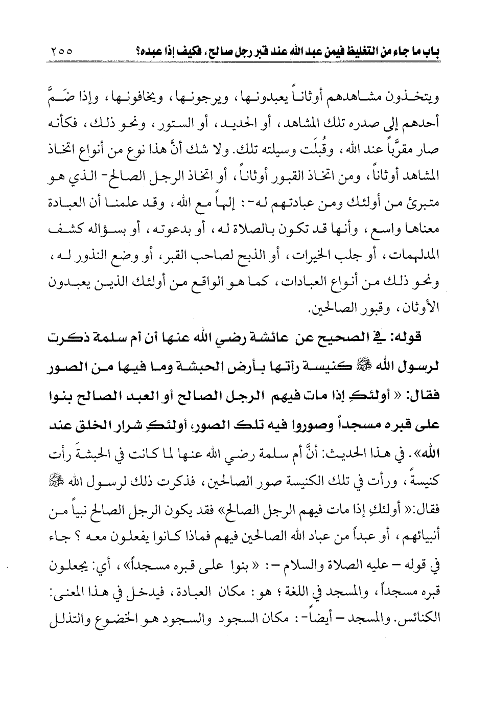 قوله: في الصحيح عن عائشة - رضي الله عنها - «أن أم سلمة ذكرت لرسول الله صلى الله عليه وسلم كنيسة رأتها بأرض الحبشة وما فيها من الصور، فقال: " أولئك إذا مات فيهم الرجل الصالح أو العبد الصالح بنوا على قبره مسجدا وصوروا فيه تلك الصور، أولئك شرار الخلق عند الله» . في هذا الحديث: أن أم سلمة - رضي الله عنها - لما كانت في الحبشة رأت كنيسة، ورأت في تلك الكنيسة صور الصالحين، فذكرت ذلك لرسول الله صلى الله عليه وسلم فقال: «أولئك إذا مات فيهم الرجل الصالح» فقد يكون الرجل الصالح نبيا من أنبيائهم، أو عبدا من عباد الله الصالحين فيهم، فماذا كانوا يفعلون معه؟ جاء في قوله عليه الصلاة والسلام: «بنوا على قبره مسجدا» ، أي: يجعلون قبره مسجدا، والمسجد في اللغة؛ هو: مكان العبادة، فيدخل في هذا المعنى: الكنائس. والمسجد أيضا: مكان السجود. والسجود هو الخضوع والتذلل