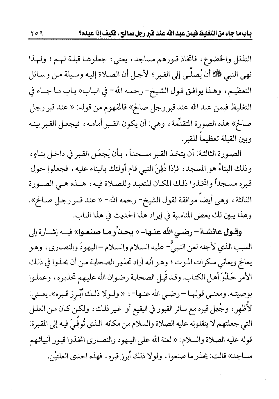 ـــــــــــــــــــــــــــــQالتذلل والخضوع، فاتخاذ قبورهم مساجد، يعني: جعلوها قبلة لهم؛ ولهذا نهى النبي صلى الله عليه وسلم أن يصلي إلى القبر؛ لأجل أن الصلاة إليه وسيلة من وسائل التعظيم، وهذا يوافق قول الشيخ - رحمه الله - في الباب " باب ما جاء في التغليظ فيمن عبد الله عند قبر رجل صالح "، فالمفهوم من قوله: " عند قبر رجل صالح " هذه الصورة المتقدمة، وهي: أن يكون القبر أمامه، فيجعل القبر بينه وبين القبلة تعظيما للقبر.