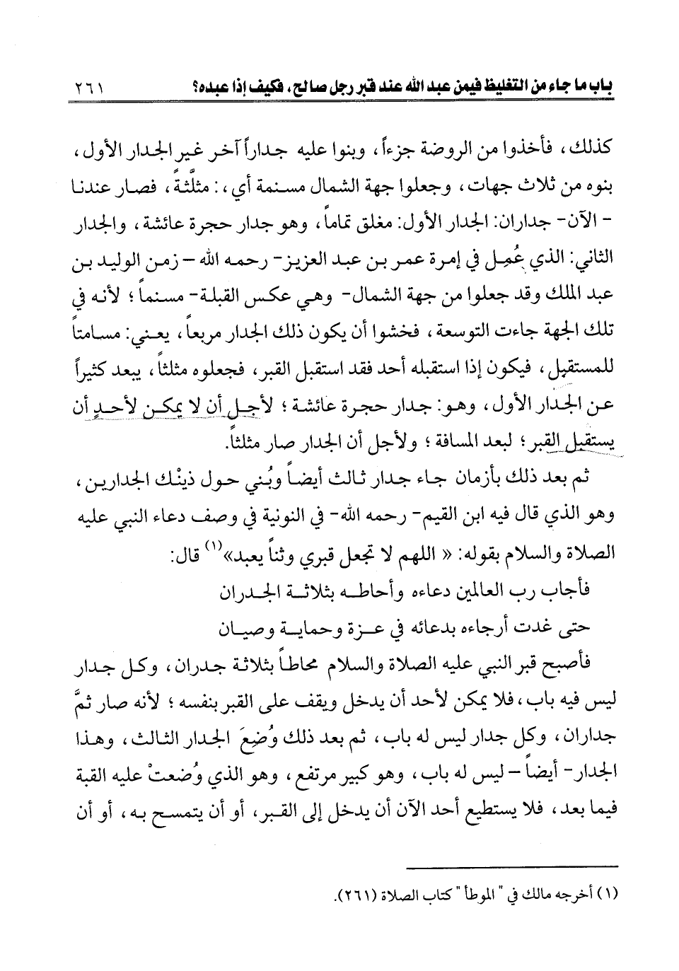 ـــــــــــــــــــــــــــــQكذلك، فأخذوا من الروضة جزءا، وبنوا عليه جدارا آخر غير الجدار الأول، بنوه من ثلاث جهات، وجعلوا جهة الشمال مسنمة أي: مثلثة، فصار عندنا الآن جداران: الجدار الأول: مغلق تماما، وهو جدار حجرة عائشة، والجدار الثاني: الذي عمل في إمرة عمر بن عبد العزيز - رحمه الله - زمن الوليد بن عبد الملك وقد جعلوا من جهة الشمال - وهي عكس القبلة - مسنما؛ لأنه في تلك الجهة جاءت التوسعة، فخشوا أن يكون ذلك الجدار مربعا، يعني: مسامتا للمستقبل، فيكون إذا استقبله أحد فقد استقبل القبر، فجعلوه مثلثا، يبعد كثيرا عن الجدار الأول، وهو: جدار حجرة عائشة؛ لأجل أن لا يمكن لأحد أن يستقبل القبر؛ لبعد المسافة؛ ولأجل أن الجدر صار مثلثا.
