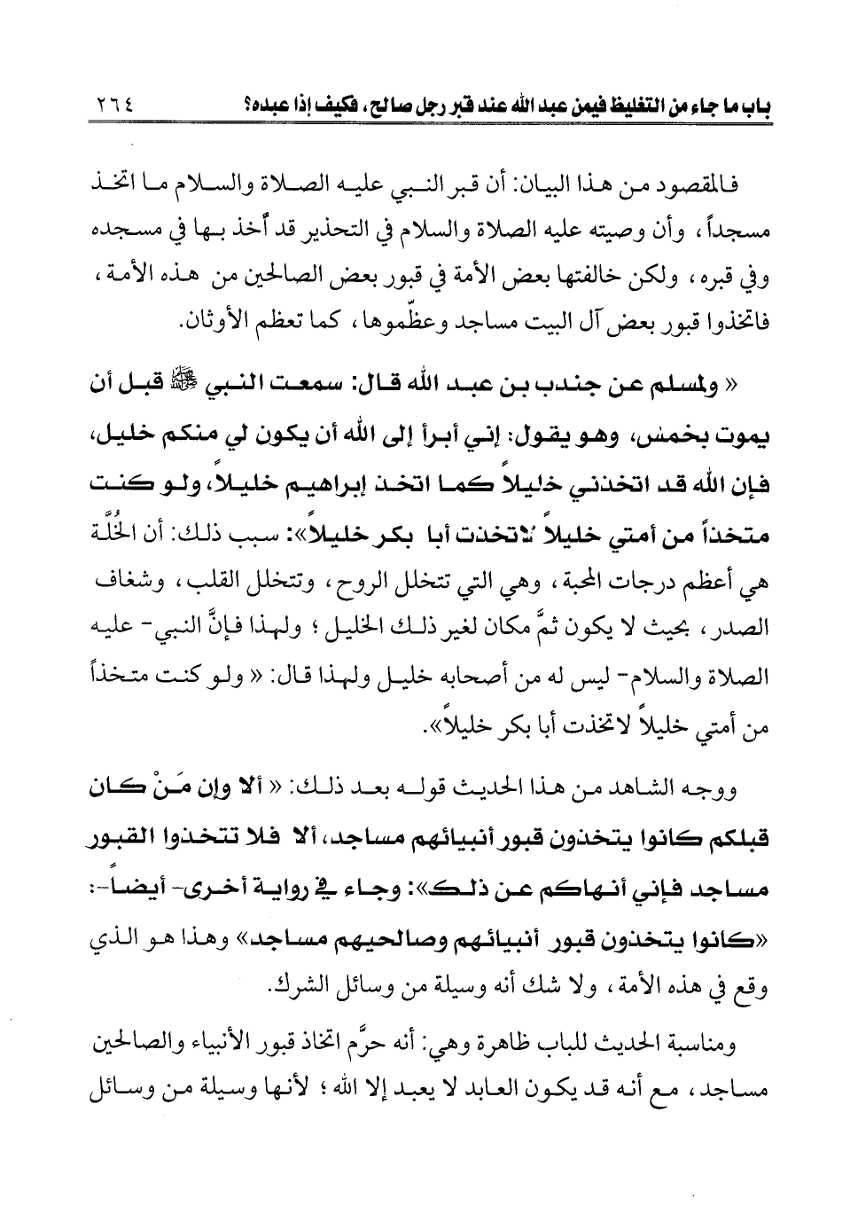 ووجه الشاهد من هذا الحديث قوله بعد ذلك: «ألا وإن من كان قبلكم كانوا يتخذون قبور أنبيائهم مساجد، ألا فلا تتخذوا القبور مساجد فإني أنهاكم عن ذلك» : وجاء في رواية أخرى أيضا: «كانوا يتخذون قبور أنبيائهم وصالحيهم مساجد» ، وهذا هو الذي وقع في هذه الأمة، ولا شك أنه وسيلة من وسائل الشرك.