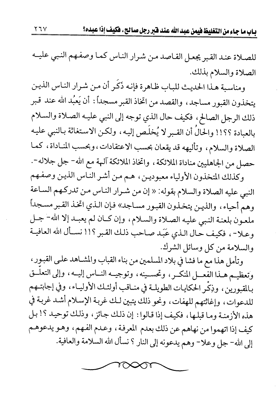 ومناسبة هذا الحديث للباب ظاهرة فإنه ذكر أن من شرار الناس الذين يتخذون القبور مساجد، والقصد من اتخاذ القبر مسجدا: أن يعبد الله عند قبر ذلك الرجل الصالح، فكيف حال الذي توجه إلى النبي عليه الصلاة والسلام بالعبادة؟ ؟ !! والحال أن القبر لا يخلص إليه، ولكن الاستغاثة بالنبي عليه الصلاة والسلام، وتأليهه قد يقعان بحسب الاعتقادات، وبحسب المناداة، كما حصل من الجاهليين مناداة الملائكة، واتخاذ الملائكة آلهة مع الله جل جلاله. وكذلك المتخذون الأولياء معبودين، هم من أشر الناس الذين وصفهم النبي - عليه الصلاة والسلام - بقوله «إن من شرار الناس من تدركهم الساعة وهم أحياء، والذين يتخذون القبور مساجد» ، فإن الذي اتخذ القبر مسجدا ملعون بلعنة النبي عليه الصلاة والسلام، وإن كان لم يعبد إلا الله جل وعلا، فكيف حال الذي عبد صاحب ذلك القبر؟ !! نسأل الله العافية والسلامة من كل وسائل الشرك.