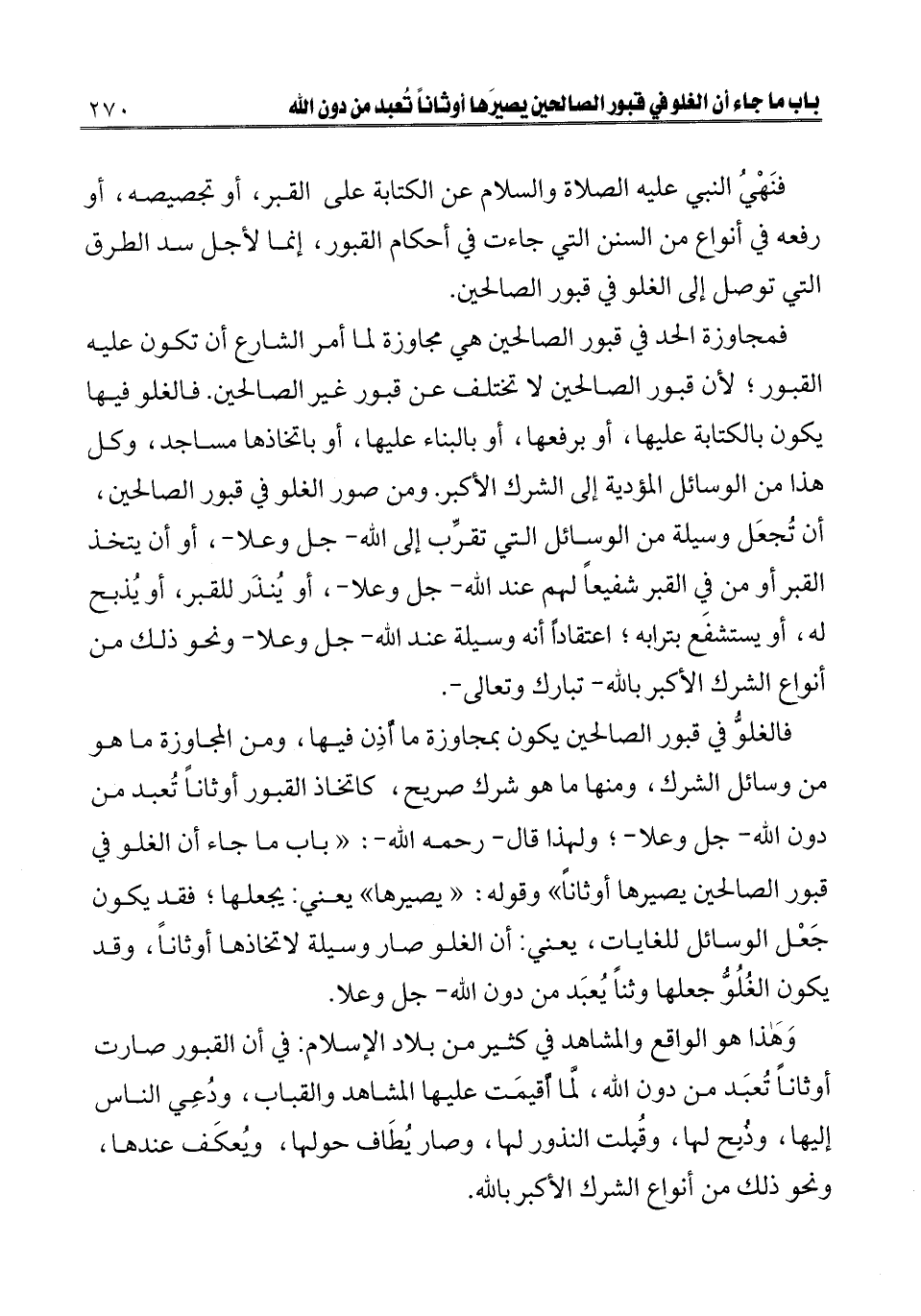 وهذا هو الواقع والمشاهد في كثير من بلاد الإسلام: في أن القبور صارت أوثانا تعبد من دون الله، لما أقيمت عليها المشاهد والقباب، ودعي الناس إليها، وذبح لها، وقبلت النذور لها، وصار يطاف حولها، ويعكف عندها، ونحو ذلك من أنواع الشرك الأكبر بالله.