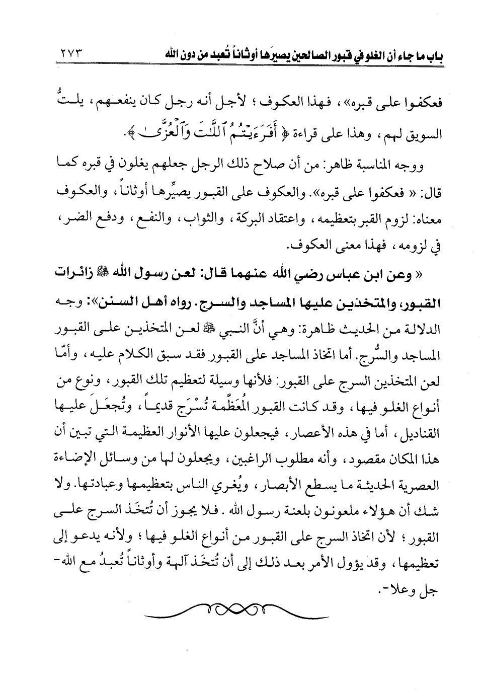 " وعن ابن عباس - رضي الله عنهما - قال: «لعن رسول الله صلى الله عليه وسلم زائرات القبور، والمتخذين عليها المساجد والسرج» . رواه أهل السنن ": وجه الدلالة من الحديث ظاهرة: وهي أن النبي صلى الله عليه وسلم لعن المتخذين على القبور المساجد والسرج. أما اتخاذ المساجد على القبور فقد سبق الكلام عليه، وأما لعن المتخذين السراج على القبور: فلأنها وسيلة لتعظيم تلك القبور، ونوع من أنواع الغلو فيها، وقد كانت القبور المعظمة تسرج قديما، وتجعل عليها القناديل، أما في هذه الأعصار، فيجعلون عليها الأنوار العظيمة التي تبين أن هذا المكان مقصود، وأنه مطلوب الراغبين، ويجعلون لها من وسائل الإضاءة العصرية الحديثة ما يسطع الأبصار، ويغري الناس بتعظيمها وعبادتها. ولا شك أن هؤلاء ملعونون بلعنة رسول الله. فلا يجوز أن تتخذ السرج على القبور؛ لأن اتخاذ السرج على القبور من أنواع الغلو فيها؛ ولأنه يدعو إلى تعظيمها، وقد يؤول الأمر بعد ذلك إلى أن تتخذ آلهة وأوثانا تعبد مع الله جل وعلا.