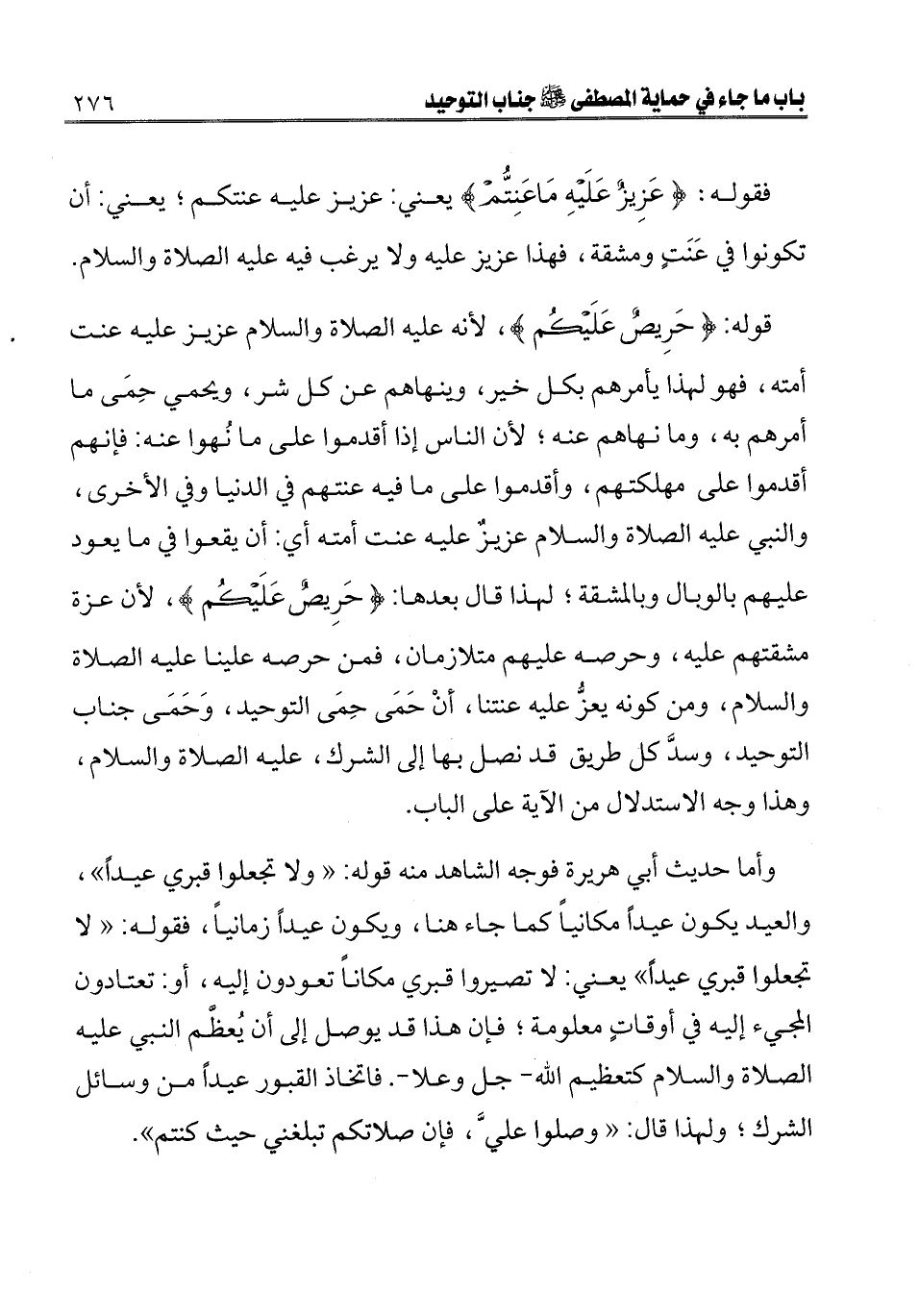 قوله: {حَرِيصٌ عَلَيْكُمْ} [التوبة: 128] لأنه عليه الصلاة والسلام عزيز عليه عنت أمته، فهو لهذا يأمرهم بكل خير، وينهاهم عن كل شر، ويحمي حمى ما أمرهم به، وما نهاهم عنه؛ لأن الناس إذا أقدموا على ما نهوا عنه: فإنهم أقدموا على مهلكتهم، وأقدموا على ما فيه عنتهم في الدنيا وفي الأخرى، والنبي - عليه الصلاة والسلام - عزيز عليه عنت أمته أي: أن يقعوا في ما يعود عليهم بالوبال وبالمشقة؛ لهذا قال بعدها: {حَرِيصٌ عَلَيْكُمْ} [التوبة: 128] لأن عزة مشقتهم عليه، وحرصه عليهم متلازمان، فمن حرصه علينا عليه الصلاة والسلام، ومن كونه يعز عليه عنتنا، أن حمى حمى التوحيد، وحمى جناب التوحيد، وسد كل طريق قد نصل بها إلى الشرك، عليه الصلاة والسلام، وهذا وجه الاستدلال من الآية على الباب.