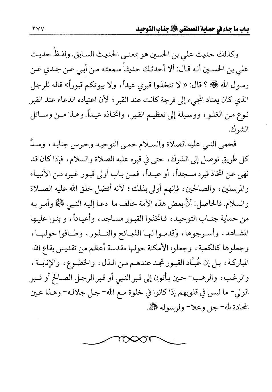 ـــــــــــــــــــــــــــــQوكذلك حديث علي بن الحسين هو بمعنى الحديث السابق. ولفظ حديث علي بن الحسين أنه قال: «ألا أحدثك حديثا سمعته من أبي عن جدي عن رسول الله صلى الله عليه وسلم؟ قال: " لا تتخذوا قبري عيدا، ولا بيوتكم قبورا» قاله للرجل الذي كان يعتاد المجيء إلى فرجة كانت عند القبر؛ لأن اعتياده الدعاء عند القبر نوع من الغلو، ووسيلة إلى تعظيم القبر، واتخاذه عيدا. وهذا من وسائل الشرك.