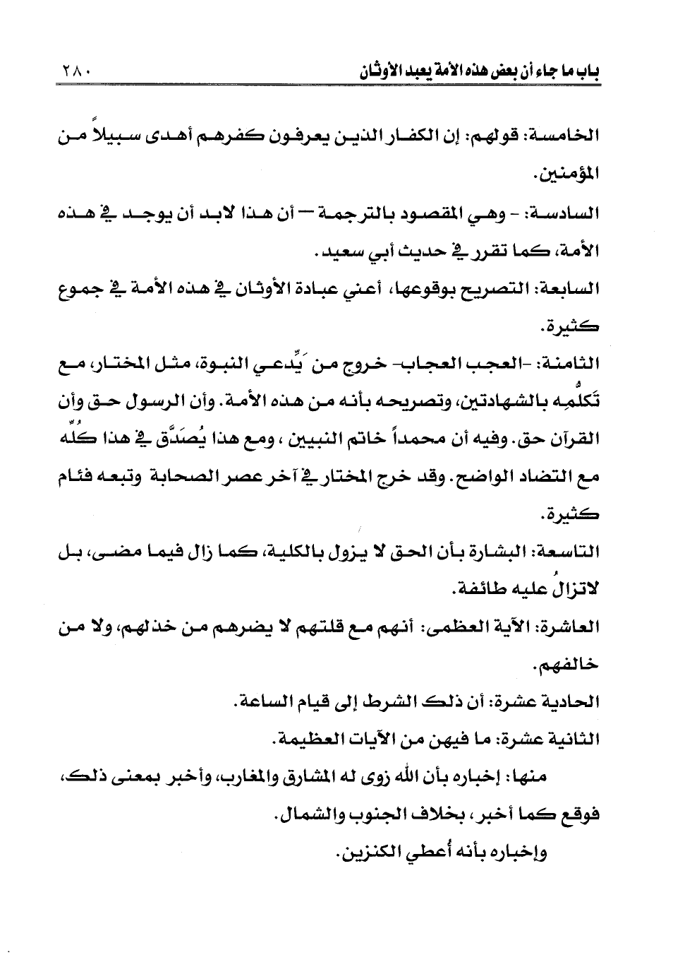 الثامنة: - العجب العجاب - خروج من يدعي النبوة، مثل المختار، مع تكلمه بالشهادتين، وتصريحه بأنه من هذه الأمة. وأن الرسول حق وأن القرآن حق. وفيه أن محمدا خاتم النبيين، ومع هذا يصدق في هذا كله مع التضاد الواضح. وقد خرج المختار في آخر عصر الصحابة وتبعه فئام كثيرة.