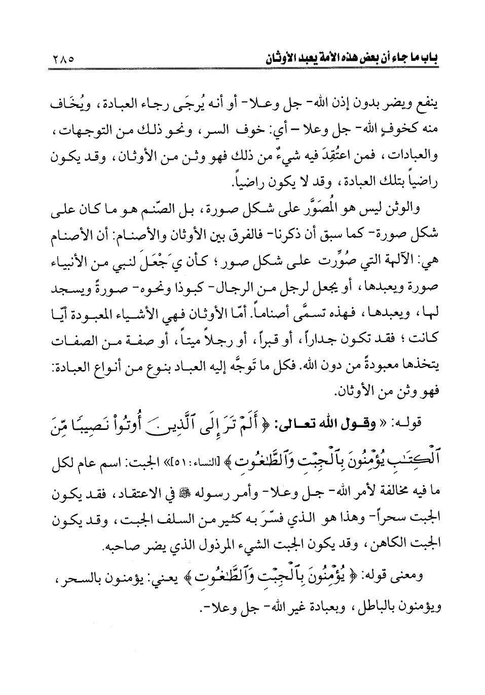 قوله: " وقول الله تعالى: {أَلَمْ تَرَ إِلَى الَّذِينَ أُوتُوا نَصِيبًا مِنَ الْكِتَابِ يُؤْمِنُونَ بِالْجِبْتِ وَالطَّاغُوتِ} [النساء: 51] [النساء: 51] الجبت: اسم عام لكل ما فيه مخالفة لأمر الله- جل وعلا- وأمر رسوله صلى الله عليه وسلم في الاعتقاد، فقد يكون الجبت سحرا- وهذا هو الذي فسر به كثير من السلف الجبت، وقد يكون الجبت الكاهن، وقد يكون الجبت الشيء المرذول الذي يضر صاحبه.