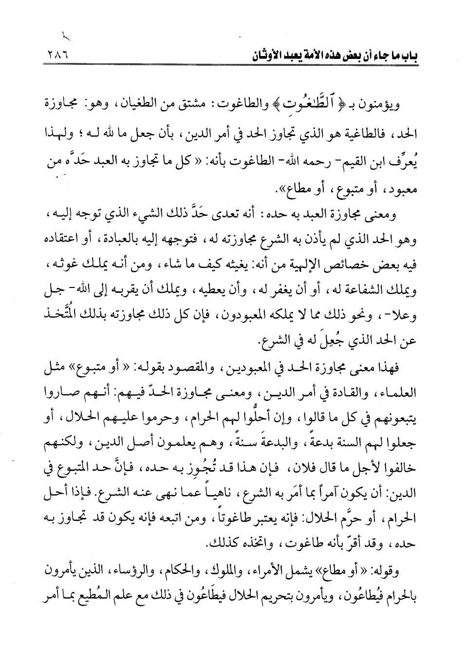 ـــــــــــــــــــــــــــــQويؤمنون ب (الطاغوت) والطاغوت: مشتق من الطغيان، وهو: مجاوزة الحد، فالطاغية هو الذي تجاوز الحد في أمر الدين، بأن جعل ما لله له؛ ولهذا يعرف ابن القيم -رحمه الله- الطاغوت بأنه: " كل ما تجاوز به العبد حده من معبود، أو متبوع، أو مطاع ".