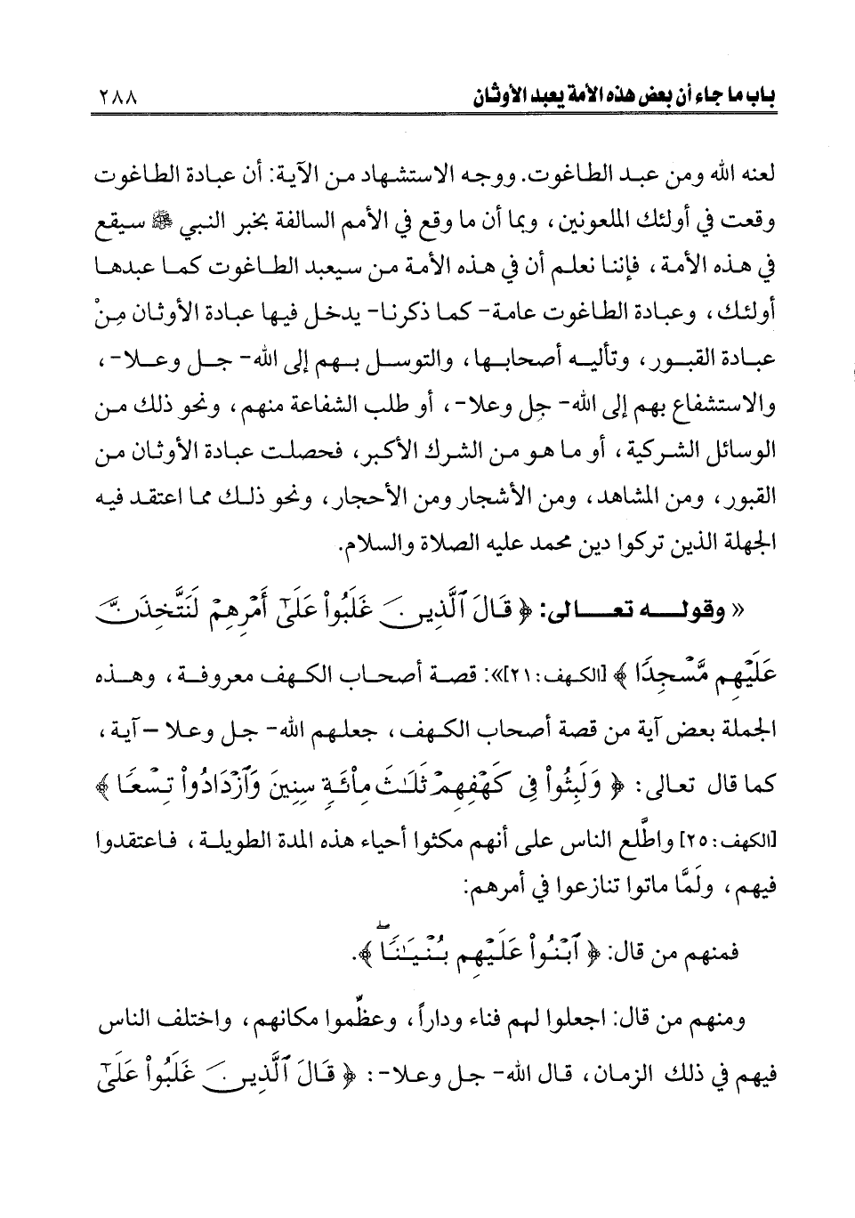 ـــــــــــــــــــــــــــــQلعنه الله ومن عبد الطاغوت. ووجه الاستشهاد من الآية أن عبادة الطاغوت وقعت في أولئك الملعونين، وبما أن ما وقع في الأمم السالفة بخبر النبي صلى الله عليه وسلم سيقع في هذه الأمة، فإننا نعلم أن في هذه الأمة من سيعبد الطاغوت كما عبدها أولئك، وعبادة الطاغوت عامة- كما ذكرنا- يدخل فيها عبادة الأوثان من عبادة القبور، وتأليه أصحابها، والتوسل بهم إلى الله- جل وعلا-، والاستشفاع بهم إلى الله- جل وعلا-، أو طلب الشفاعة منهم، ونحو ذلك من الوسائل الشركية، أو ما هو من الشرك الأكبر، فحصلت عبادة الأوثان من القبور، ومن المشاهد، ومن الأشجار ومن الأحجار، ونحو ذلك مما اعتقد فيه الجهلة الذين تركوا دين محمد -عليه الصلاة والسلام-. " وقوله تعالى: {قَالَ الَّذِينَ غَلَبُوا عَلَى أَمْرِهِمْ لَنَتَّخِذَنَّ عَلَيْهِمْ مَسْجِدًا} [الكهف: 21] [الكهف: 21] : قصة أصحاب الكهف معروفة، وهذه الجملة بعض آية من قصة أصحاب الكهف، جعلهم الله- جل وعلا- آية، كما قال تعالى: {وَلَبِثُوا فِي كَهْفِهِمْ ثَلَاثَ مِائَةٍ سِنِينَ وَازْدَادُوا تِسْعًا} [الكهف: 25] [الكهف: 21] واطلع الناس على أنهم مكثوا أحياء هذه المدة الطويلة، فاعتقدوا فيهم، ولما ماتوا تنازعوا في أمرهم.