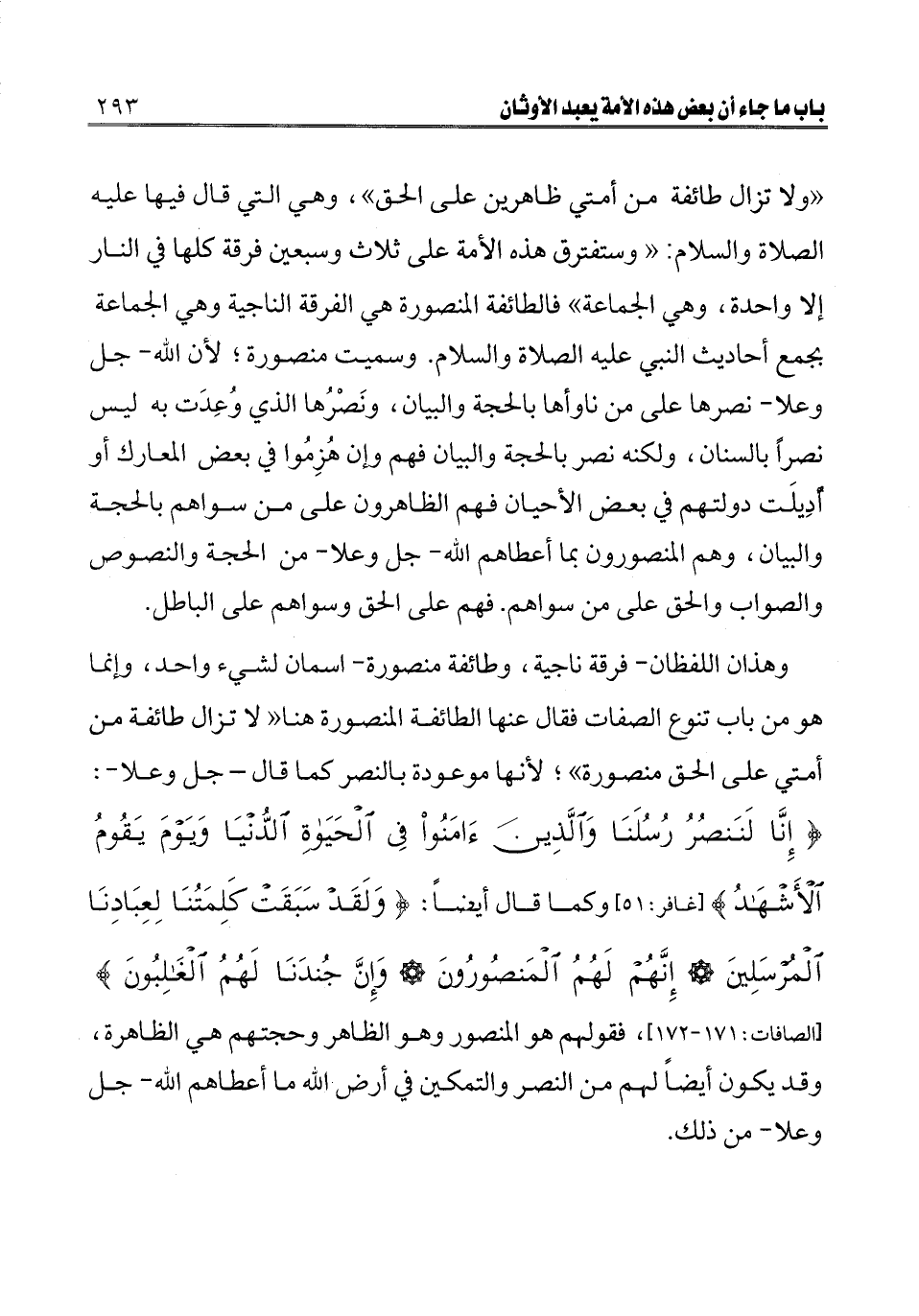 ـــــــــــــــــــــــــــــQ «ولا تزال طائفة من أمتي ظاهرين على الحق» ، وهي التي قال فيها -عليه الصلاة والسلام-: «وستفترق هذه الأمة على ثلاث وسبعين فرقة كلها في النار إلا واحدة، وهي الجماعة» فالطائفة المنصورة هي الفرقة الناجية وهي الجماعة بجمع أحاديث النبي -عليه الصلاة والسلام-. وسميت منصورة؛ لأن الله- جل وعلا- نصرها على من ناوأها بالحجة والبيان، ونصرها الذي وعدت به ليس نصرا بالسنان، ولكنه نصر بالحجة والبيان، فهم وإن هزموا في بعض المعارك أو أديلت دولتهم في بعض الأحيان فهم الظاهرون على من سواهم بالحجة والبيان، وهم المنصورون بما أعطاهم الله- جل وعلا- من الحجة والنصوص والصواب والحق على من سواهم. فهم على الحق وسواهم على الباطل.