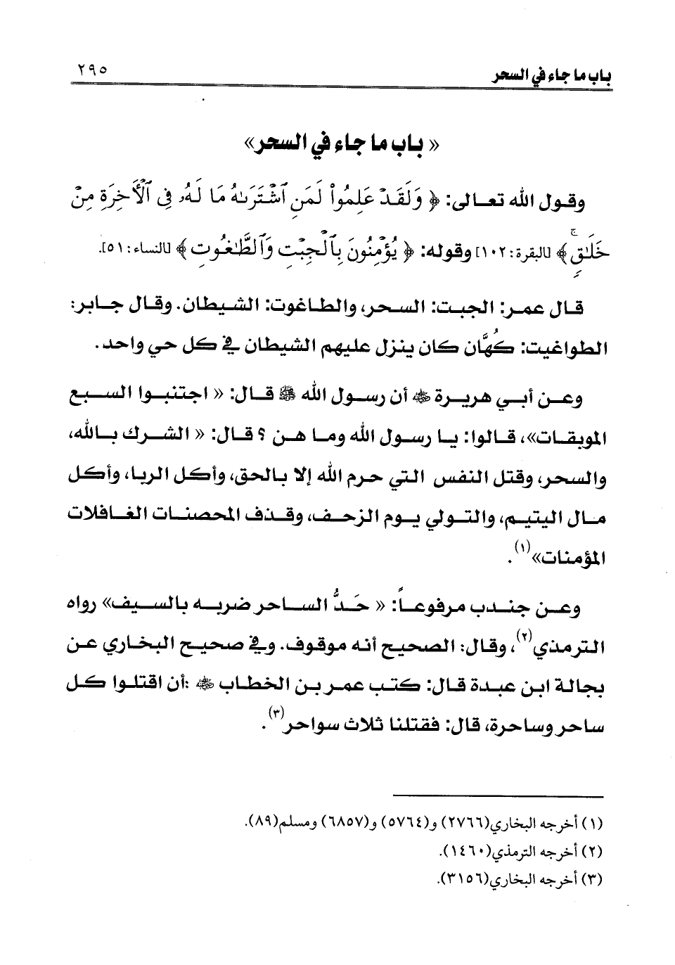 "باب ما جاء في السحر" وقول الله تعالى: {وَلَقَدْ عَلِمُوا لَمَنِ اشْتَرَاهُ مَا لَهُ فِي الْآخِرَةِ مِنْ خَلَاقٍ} [البقرة: 102] [البقرة: 102] وقوله {يُؤْمِنُونَ بِالْجِبْتِ وَالطَّاغُوتِ} [النساء: 51] [النساء: 51] .