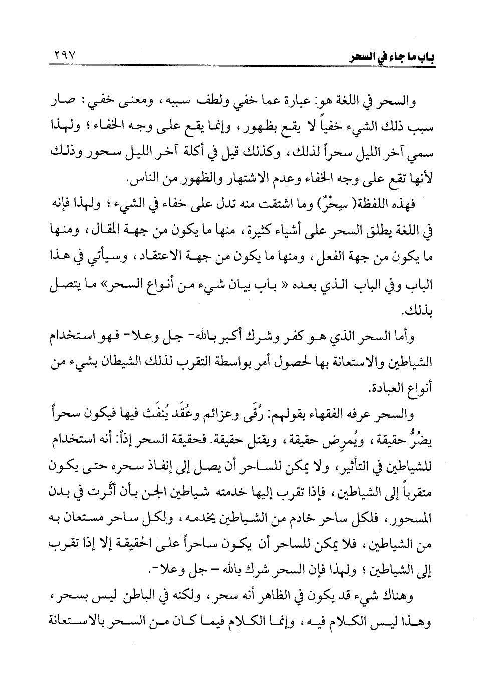 فهذه اللفظة (سحر) وما اشتقت منه تدل على خفاء في الشيء؛ ولهذا فإنه في اللغة يطلق السحر على أشياء كثيرة، منها ما يكون من جهة المقال، ومنها ما يكون من جهة الفعل، ومنها ما يكون من جهة الاعتقاد، وسيأتي في هذا الباب وفي الباب الذي بعده " باب بيان شيء من أنواع السحر" ما يتصل بذلك.