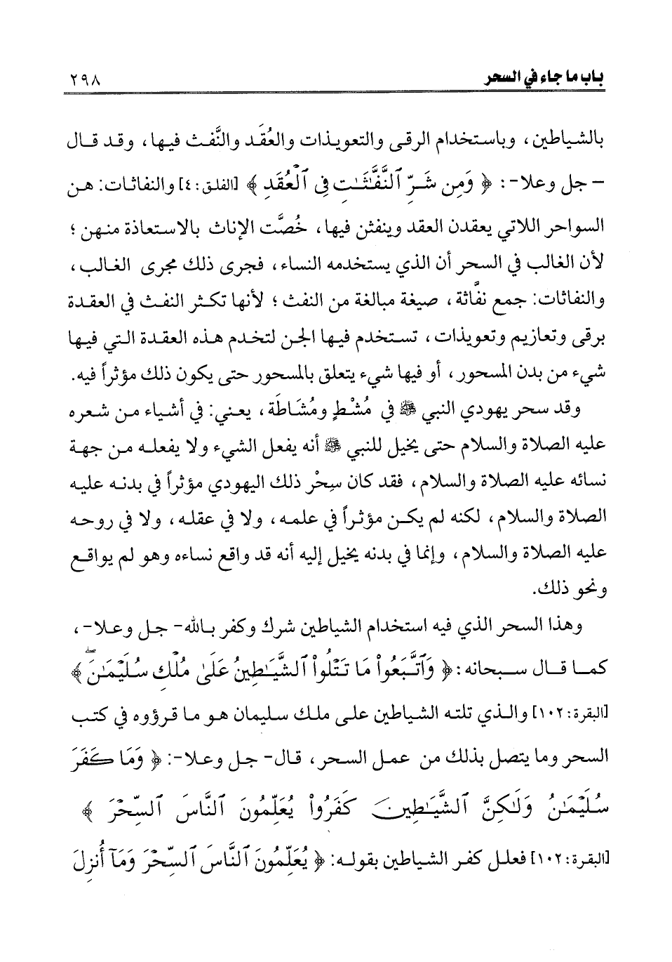 وهذا السحر الذي فيه استخدام الشياطين شرك وكفر بالله- جل وعلا-، كما قال سبحانه: {وَاتَّبَعُوا مَا تَتْلُو الشَّيَاطِينُ عَلَى مُلْكِ سُلَيْمَانَ} [البقرة: 102] [البقرة: 102] والذي تلته الشياطين على ملك سليمان هو ما قرؤوه في كتاب السحر وما يتصل بذلك من عمل السحر، قال- جل وعلا-. {وَمَا كَفَرَ سُلَيْمَانُ وَلَكِنَّ الشَّيَاطِينَ كَفَرُوا يُعَلِّمُونَ النَّاسَ السِّحْرَ} [البقرة: 102] [البقرة: 102] فعلل كفر الشياطين بقوله: {يُعَلِّمُونَ النَّاسَ السِّحْرَ وَمَا أُنْزِلَ عَلَى الْمَلَكَيْنِ بِبَابِلَ هَارُوتَ وَمَارُوتَ} [البقرة: 102] [البقرة: 102]
