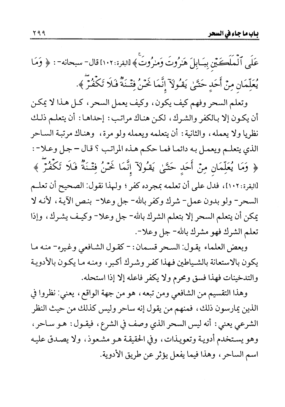وتعلم السحر وفهم كيف يكون، وكيف يعمل السحر، كل هذا لا يمكن أن يكون إلا بالكفر والشرك، لكن هناك مراتب: إحداها: أن يتعلم ذلك نظريا ولا يعمله، والثانية: أن يتعلمه ويعمله ولو مرة، وهناك مرتبة الساحر الذي يتعلم ويعمل به دائما فما حكم هذه المراتب؟ قال- جل وعلا-: {وَمَا يُعَلِّمَانِ مِنْ أَحَدٍ حَتَّى يَقُولَا إِنَّمَا نَحْنُ فِتْنَةٌ فَلَا تَكْفُرْ} [البقرة: 102] [البقرة: 102] ، فدل على أن تعلمه بمجرده كفر، ولهذا نقول: الصحيح أن تعلم السحر- ولو بدون عمل- شرك وكفر بالله- جل وعلا- بنص الآية، لأنه لا يمكن أن يتعلم السحر إلا بتعلم الشرك بالله- جل وعلا- وكيف يشرك، وإذا تعلم الشرك فهو مشرك بالله- جل وعلا-.