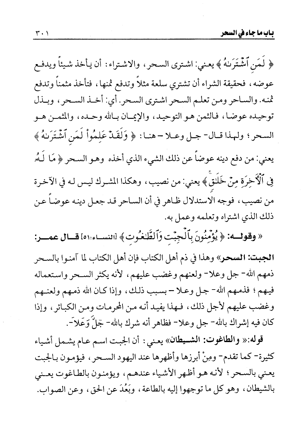 " وقوله: {يُؤْمِنُونَ بِالْجِبْتِ وَالطَّاغُوتِ} [النساء: 51] [النساء: 51] قال عمر: الجبت السحر " وهذا في ذم أهل الكتاب، فإن أهل الكتاب لما آمنوا بالسحر ذمهم الله- جل وعلا- ولعنهم وغضب عليهم، لأنه يكثر السحر واستعماله فيهم؛ فذمهم الله- جل وعلا- بسبب ذلك، وإذا كان الله ذمهم ولعنهم وغضب عليهم لأجل ذلك، فهذا يفيد أنه من المحرمات ومن الكبائر، وإذا كان فيه إشراك بالله- جل وعلا- فظاهر أنه شرك بالله- جل وعلا-.